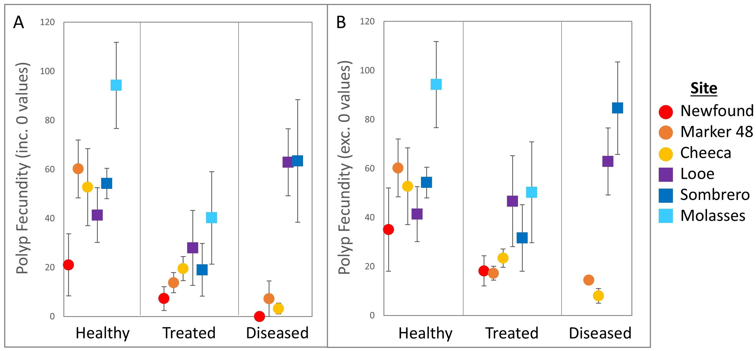 Polyp fecundity (mean ± SE) across treatments and sites for (A) all sampled Orbicella faveolata colonies and (B) only colonies with gametes present.