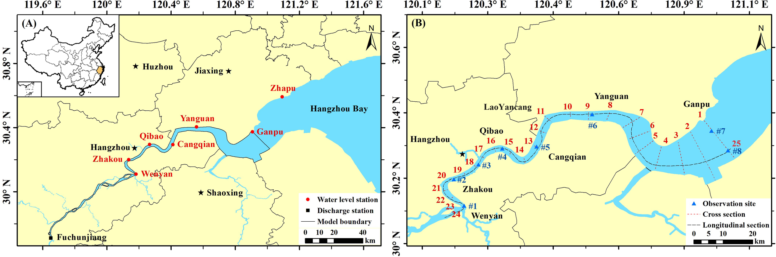 The Qiantang Estuary (119.6°-121.8°E and 29.7°-30.9°N) is the largest estuary along the East China Sea, with a total length of 282 km from Fuchunjiang hydropower station to the mouth of the Hangzhou Bay (Figure 1A). Based on its hydrodynamic characteristics, the estuary can be divided into three reaches (Li et al., 2020): runoff-dominated reach (from Fuchunjiang hydropower station to Wenyan, 78 km), tidal current and runoff affected reach (Wenyan to Ganpu, 120 km), and tide-dominated reach (Ganpu to estuary mouth, 84 km). This paper focuses on the reach influenced by both tidal currents and runoff, from Wenyan to Ganpu. A total of 25 analysis sections are set up for result analyses, and the locations of section are shown in Figure 1B.