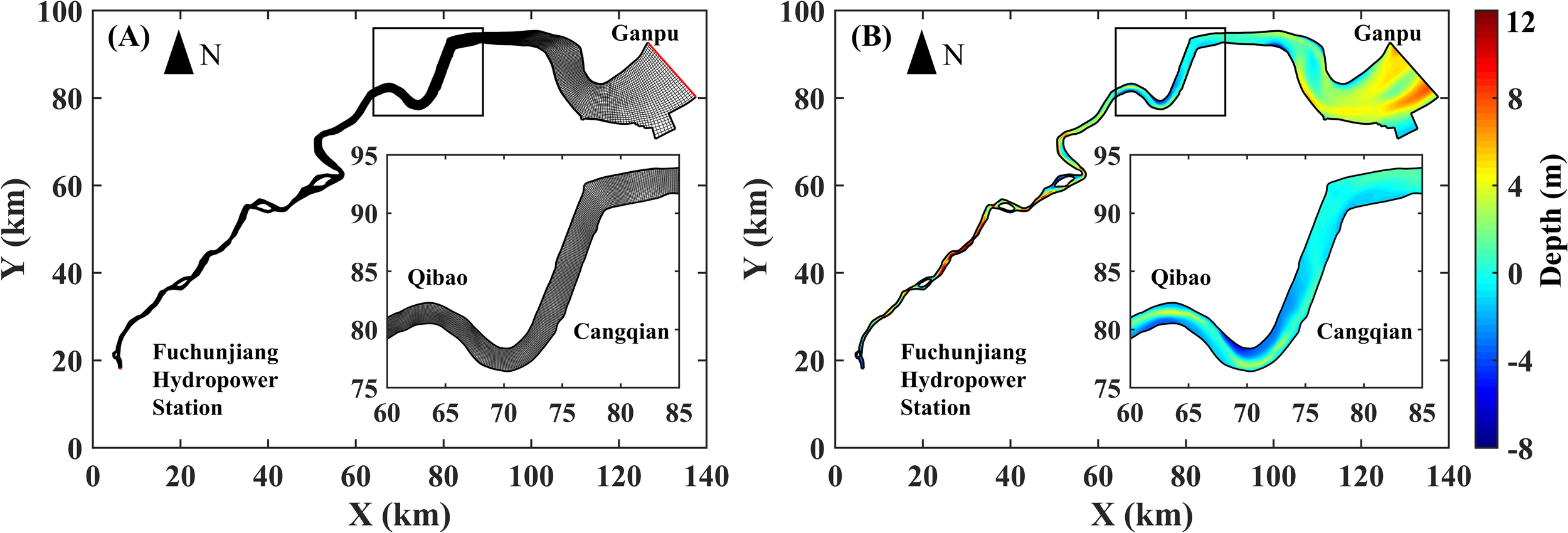 The computational domain of the model extends from the Fuchunjiang hydropower station to the Ganpu section, covering the whole tidal current and runoff affected reach, with a total length of 197 km and an area of 779 km². In the horizontal direction, we used an orthogonal curvilinear grid with a total count of approximately 387 million, as shown in Figure 2A. The grid resolution gradually increases from a maximum of 700m at the downstream boundary to less than 150m upstream, and the minimum length of grids in the focus study area (from Qibao to Yanguan) is about 50m. In the vertical direction, the model adopts a boundary-fitted σ-coordinate system and is divided into 12 layers. The thickness of each layer from surface to bottom accounts for 10%, 10%, 10%, 10%, 10%, 10%, 10%, 10%, 10%, 5%, 3%, and 2% of the total water depth, respectively. The computational time range of the model spans from May 15, 2012, 00:00, to June 1, 2012, 00:00, with a time step of 15 seconds. And the model stabilization period is determined to be 15 days based on previous stability experiments, ensuring adequate stabilization.
