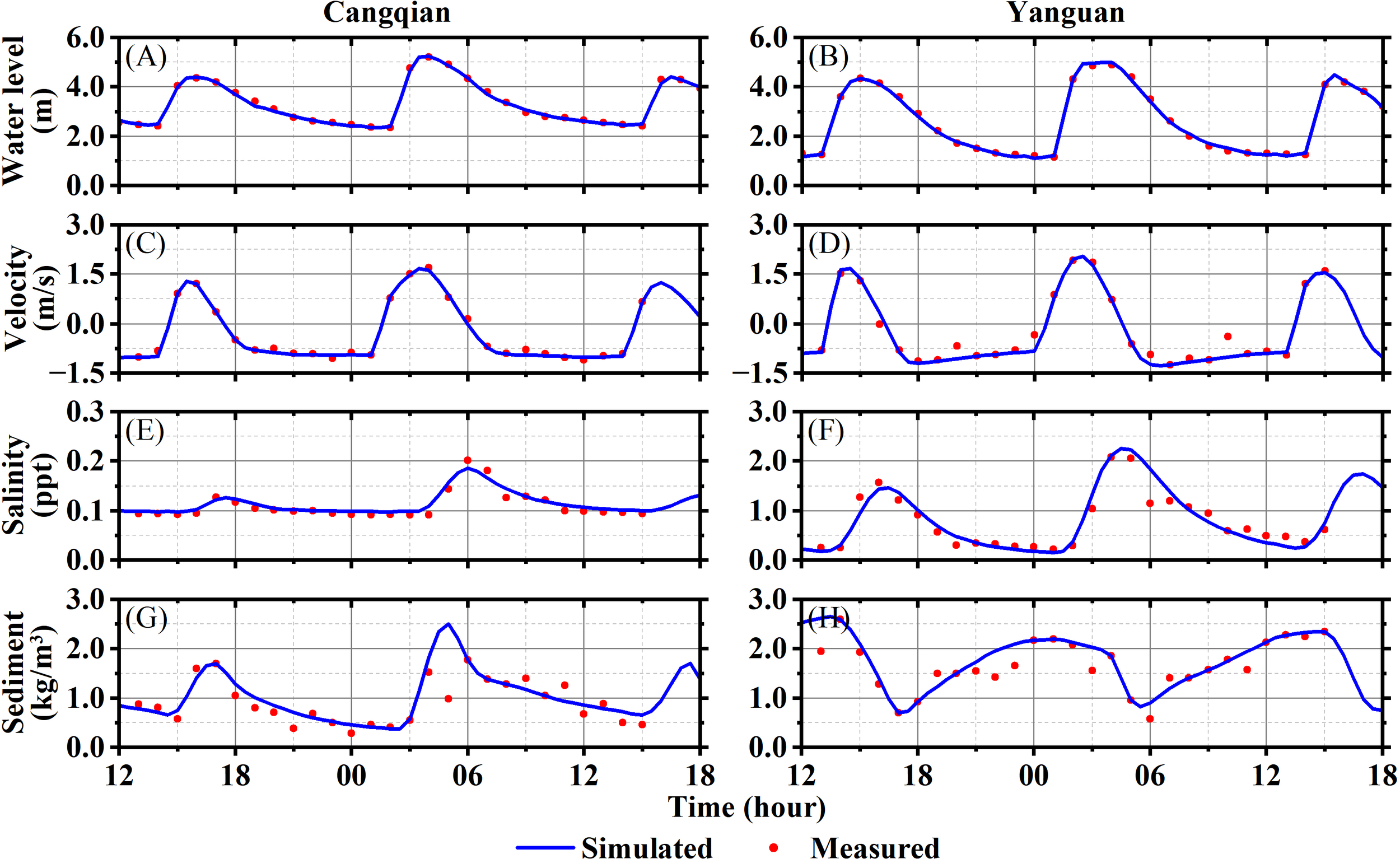 Comparison of the simulated and measured results at Cangqian and Yanguan stations during spring tide. (A, B) Water level; (C, D) Velocity; (E, F) Salinity; (G, H) SSC.