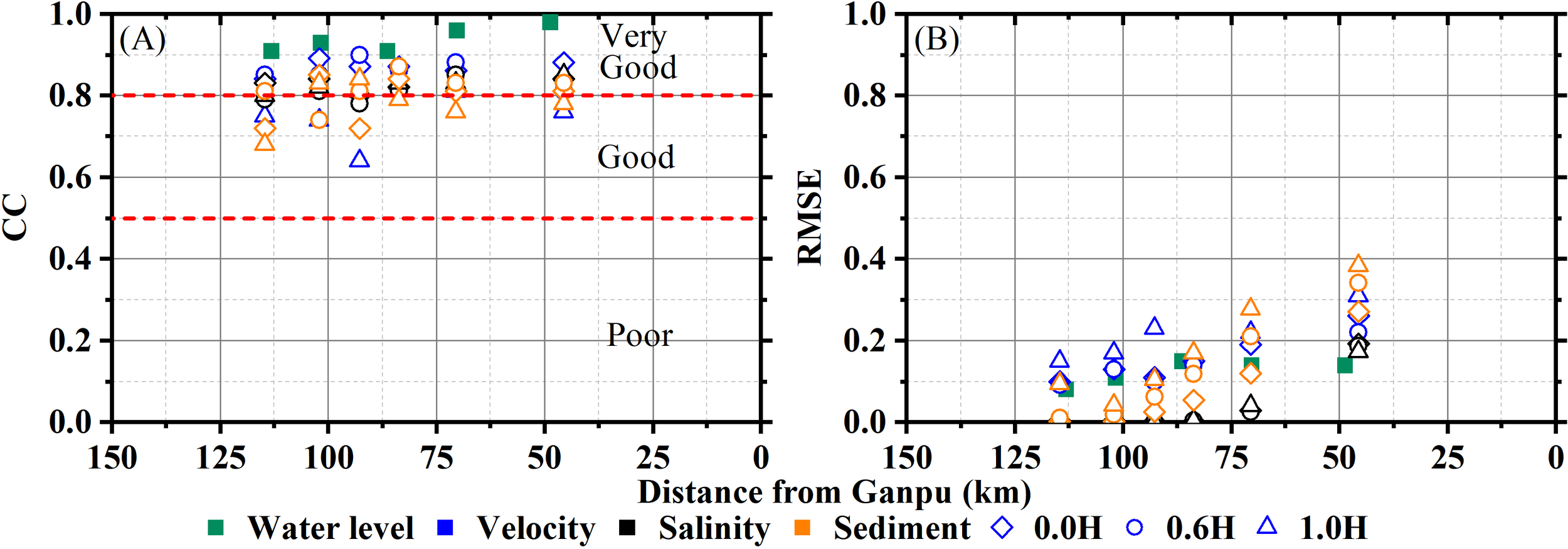 Dataset 2 is used for model validation, during which the Q from the Fuchunjiang hydropower station ranged from 1330 to 2640 m3/s, and the tidal range at the downstream Ganpu boundary varied between 5.19 and 7.51 m. The salinity ranges during spring, medium, and neap tides were 1.70-6.82, 1.86-6.28, and 1.65-4.29 ppt, respectively. The validation results for Cangqian and Yanguan stations (#5 and #6) during spring tides are shown in Figure 3. Among them, 89% of the points had error less than 10cm in tidal level, 83% had a relative error below 10% in velocity, 85% had a relative error of less than 30% in SSC, and 93% in salinity.
