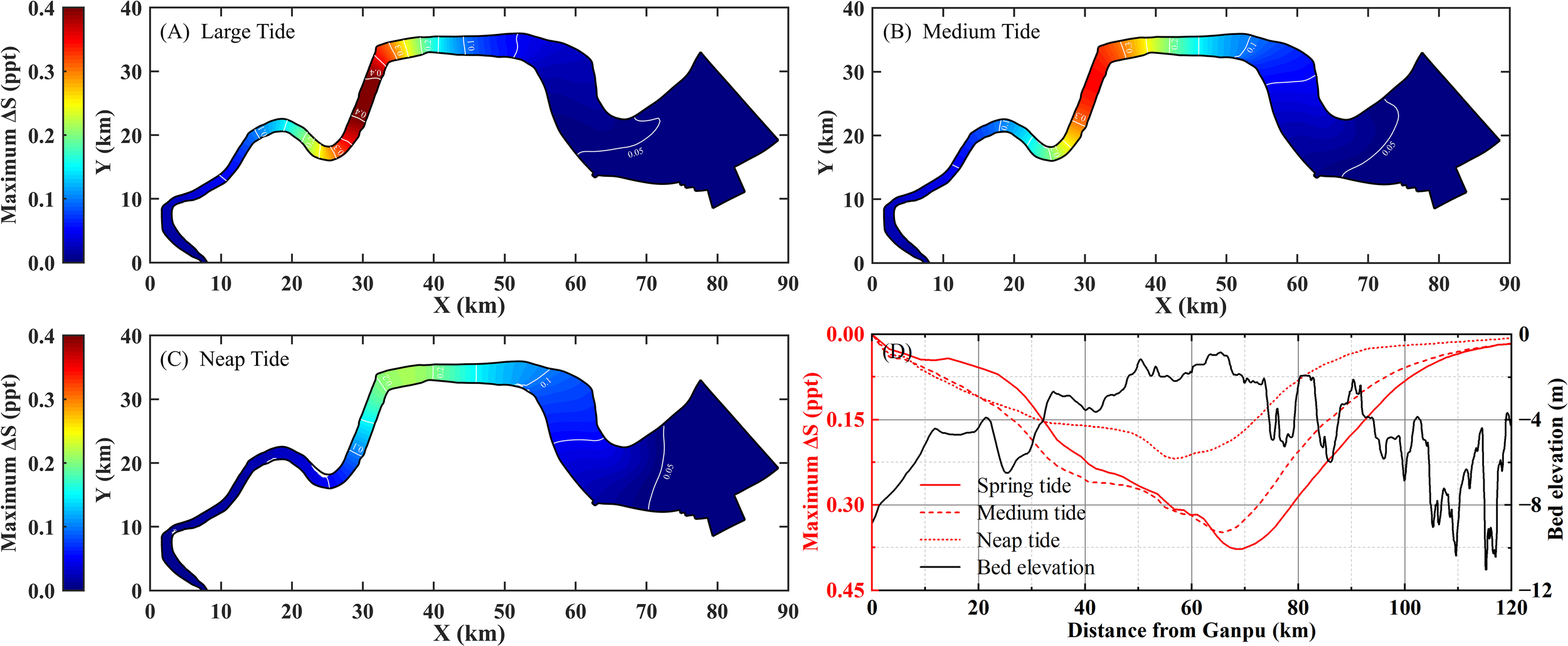 Horizontal and longitudinal distribution of the maximum ΔS caused by SSC under different tidal conditions (Q = 500 m3/s). (A-C) Horizontal distribution; (D) Longitudinal distribution.