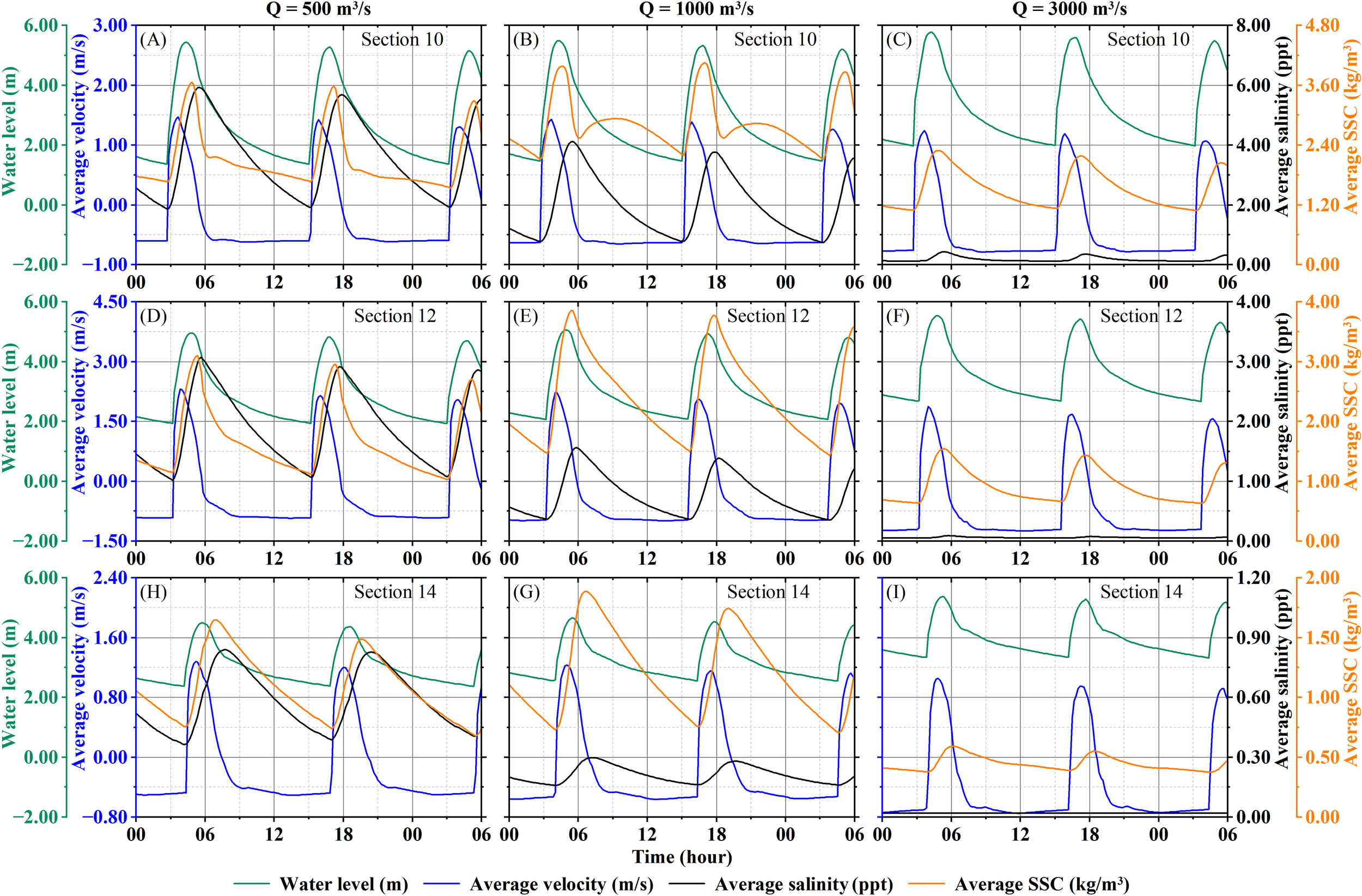 The temporal variations of water level, velocity, SC, and SSC in Sections 10-14 under different tidal conditions (Q = 500 m3/s). (A-C) Section 10; (D-F) Section 12; (H-I) Section 14.