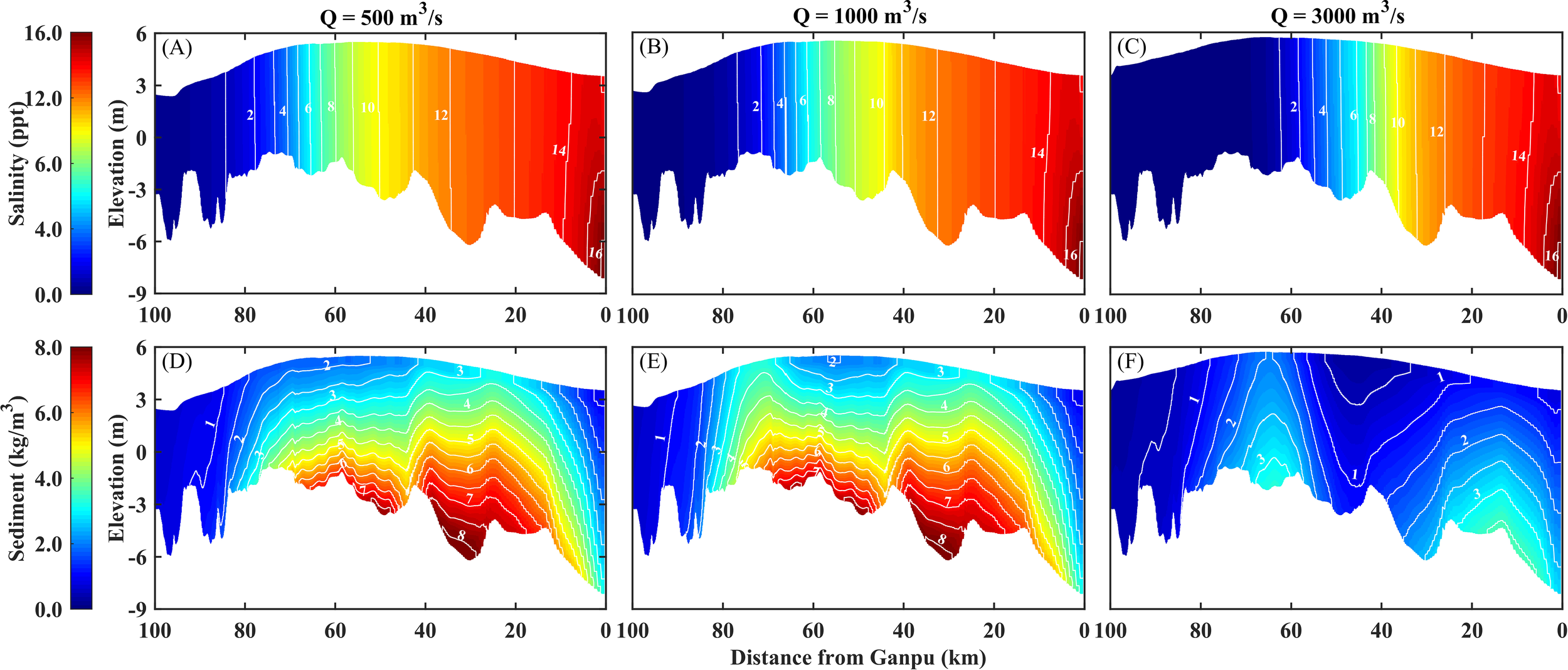 | 1 (SC) | Both sediment and salinity transport with effect of SSC on fluid density | Time range: 2011/8/25-2011/9/10 Stabilization time: 15 days Q = 500/1000/3000 m3/s |