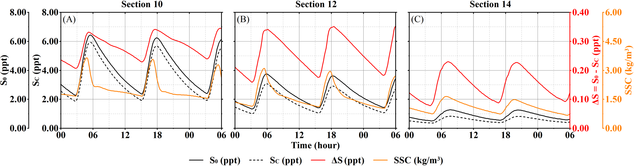 As indicated in Figure 7, the ΔS values within the study area are all positive, namely S0 > SC, indicating that the fluid density increase caused by SSC leads to a decrease in the simulated salinity results. In other words, suspended sediment can weaken the saltwater intrusion in the estuary. Taking Section 12 as an example, the maximum values of salinity reduction during spring, medium and neap tides are 0.40, 0.34, and 0.12 ppt, with reduction rates of 8.9%, 12.8%, and 12.3%, respectively. Therefore, the impact of SSC on salinity variation is considerable and cannot be ignored.