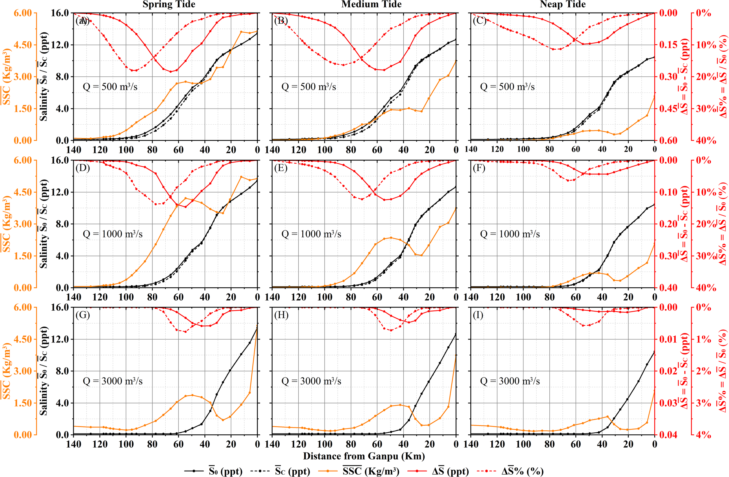 In Figure 7D, the ΔS caused by SSC initially increases and then decreases from downstream to upstream in general. The peak of ΔS is mainly located between Cangqian and Yanguan and is relatively consistent with the locations of the top of the underwater sandbar. During spring, medium and neap tides, the maximum ΔS values are 0.42, 0.35, and 0.22 ppt, occurring at 78, 73, and 64 km upstream of Ganpu. And the length of reach where ΔS exceeds 0.15 ppt can reach 65, 63, and 44 km, respectively. Comparing the ΔS distributions under different tidal conditions reveals that as the tidal range at the downstream boundary decreases, the ΔS peak value decreases and moves downstream, and the length of the reach with significant ΔS is also shortened. The main reason is that the SSC decreases as tidal dynamics weaken, and its influence on saltwater intrusion weakens accordingly.