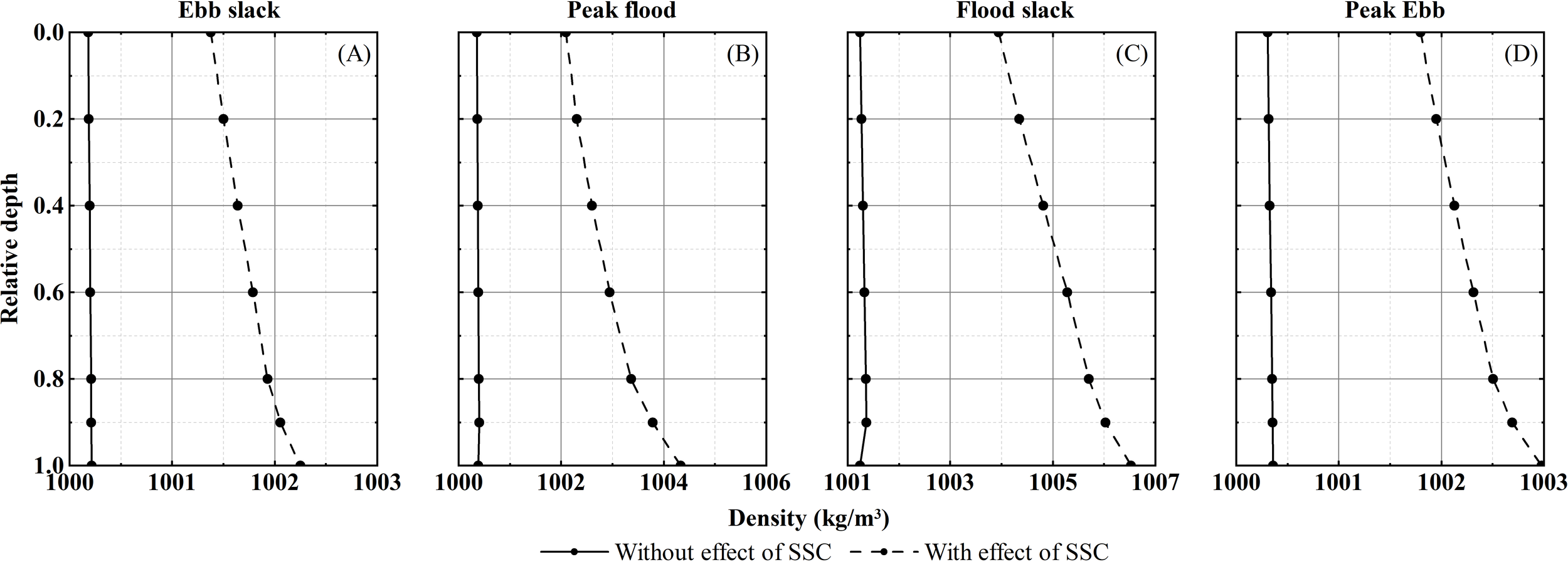 The high SSC not only leads to a significant increase in the water density, but also changes the vertical density gradient and causes stratification in the estuary, which affects the turbulence structure and water mixing (Lu et al., 2020). This phenomenon has been confirmed in many field observations and numerical simulations. Winterwerp (2001, 2006) conducted a concise literature review and numerical experiments and found that the stratification effects by cohesive and noncohesive sediment may cause an appreciable modification of the vertical profiles of velocity, vertical eddy viscosity/diffusivity, and Reynolds stresses. Jones and Monismith (2008) found that the dissipation measurements were either equal to or less than that predicted by wall-layer theory due to stratification induced by the SSC gradients near the bed in the shallow embayment of Grizzly Bay, San Francisco Bay, California. Wan and Wang (2017) used Delft3D to study the maximum turbidity zone in the Yangtze River estuary and found that SSC influenced the local density stratification when its contribution to fluid density is comparable to that of salinity, causing an impact on vertical baroclinic gradients and change in internal flow structures. Niroomandi et al. (2018) examined the suspended sediment-induced stratification in the north passage of the Yangtze River estuary by calculating eddy viscosity and found that SSC can reduce eddy viscosity by 10–30%. Stanev et al. (2019) conducted an inter-comparison of the estuaries bordering the German Bight using a 3D unstructured-grid model and found that density effects on stratification caused by high sediment concentrations resulted in a suppression of turbulence and further increase of concentration of suspended matter at the bottom. Therefore, for estuaries with high sediment concentration, the density effect of SSC must be considered in simulations of salinity transport. And the mechanism of this effect on salinity transport processes may provide a new perspective for studying estuarine coastal processes and the mechanisms of estuarine depositional dynamics.