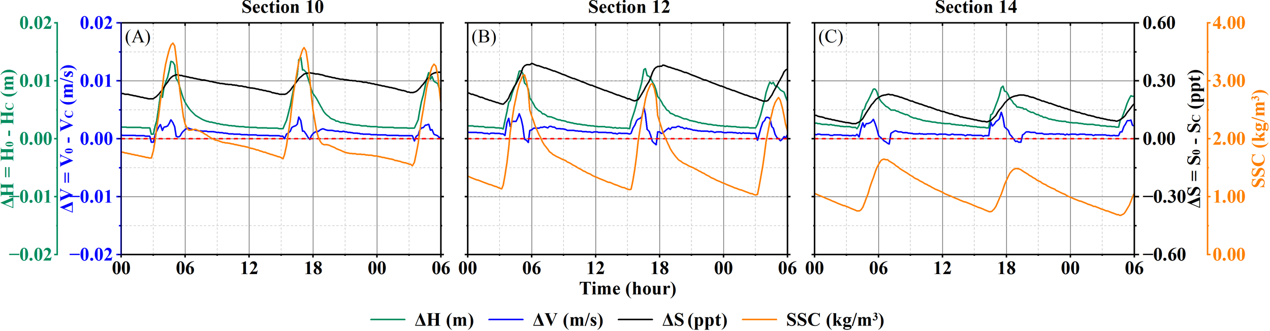 According to Figure 5, there is an obvious tidal wave deformation between Sections 10 and 14. The flood duration is significantly shorter than the ebb duration, with a ratio ranging from 0.16 to 0.24. Flood slack generally follows high tide by 50-70 minutes, while ebb slack occurs only 0-20 minutes after low tide. The peak flood occurs within 2 hours after low tide, while peak ebb isn’t significant during ebb tide. The curves of SC and SSC exhibit a single peak pattern, with the peak of SC generally appearing at the flood slack, while the peak of SSC appears 1.5-2 hours after the peak flood. The variations of SC and SSC are primarily controlled by the strength of tidal dynamics. During spring tide, the peak SC is 2.6-4.2 times of that during neap tide, while the peak SSC can reach 3-16 times higher than that during neap tide.