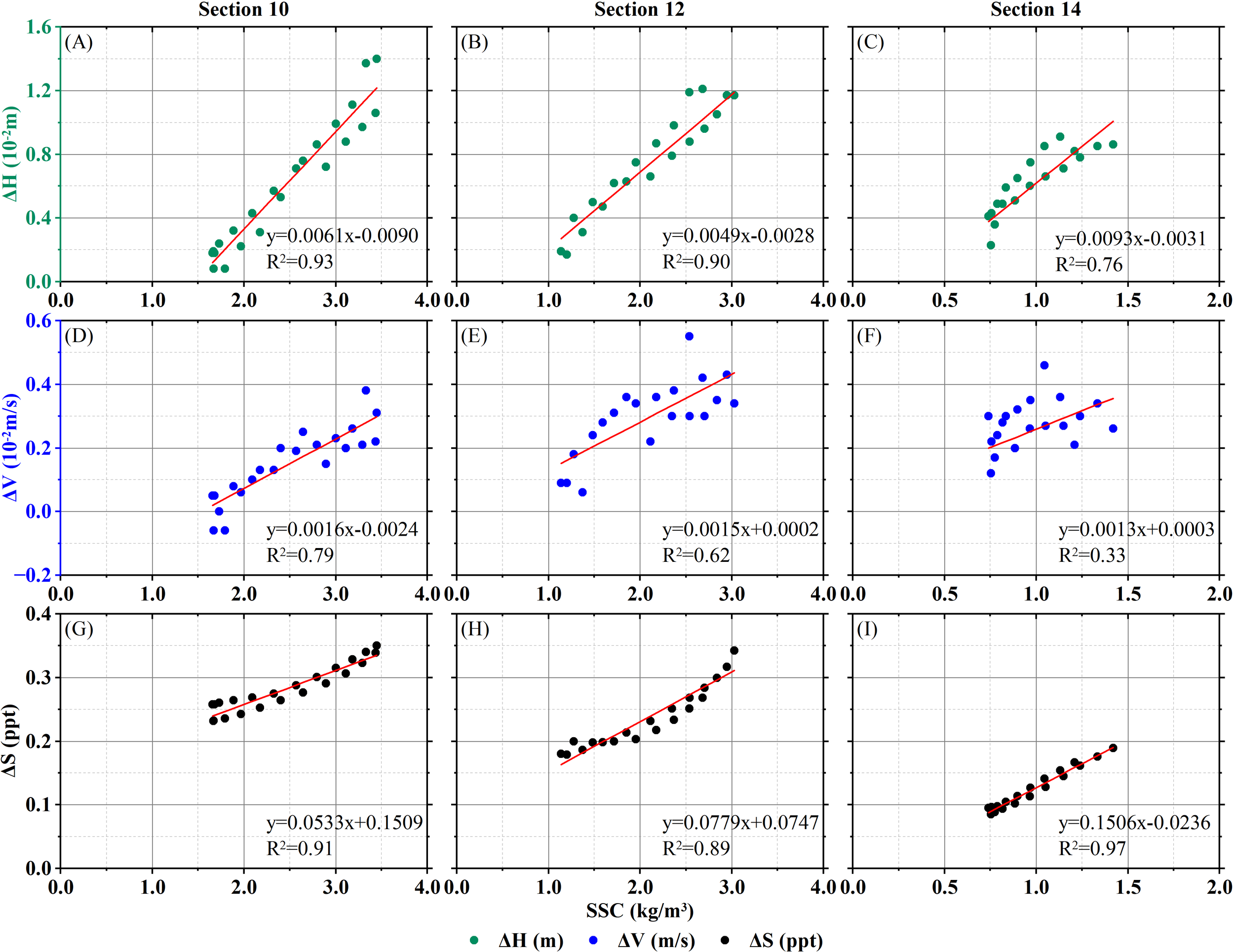 With the advancement of computer technology, numerical models based on physical processes have been widely used for salinity simulations in the estuary (Hu et al., 2019). There have been various numerical simulation studies on the factors affecting estuarine salinity distribution. Chen et al. (2016) established a three-dimensional (3D) model to study the responses of estuarine salinity distribution and transport processes to sea level rise in the Zhujiang (Pearl River) Estuary. Akter and Tanim (2021) investigated the response of salinity distribution and stratification to tidal circulation, seasonal variation, topography and river discharge in the Karnafuli River Estuary by a subgrid-scale Horizontal Large Eddy Simulation model in Delft3D. Álvarez et al. (2022)studied the impact of wave effects on salinity distribution in the Magdalena River Estuary based on field measurements and the MOHID 3D model system. Based on FVCOM numerical modeling, Shi et al. (2020) and Qin et al. (2023) investigated the influence of river discharge on salinity distribution and diffusion of the Yellow River Estuary and Laizhou Bay. Zhao et al. (2022) applied a process-based hydrodynamic model (Delft3D) to investigate the salinity distributions and variations in the Yangtze Estuary and studied the combined effects of river discharge regulation and estuarine morphological evolution on salinity dynamics. However, these models primarily focus on the effect of hydrodynamic-related factors (such as runoff, tides, wind, etc.) on salinity distribution, neglecting the impact of suspended sediment concentration (SSC) on water density. Currently, very few studies have incorporated the effect of SSC in estuarine salinity simulation.