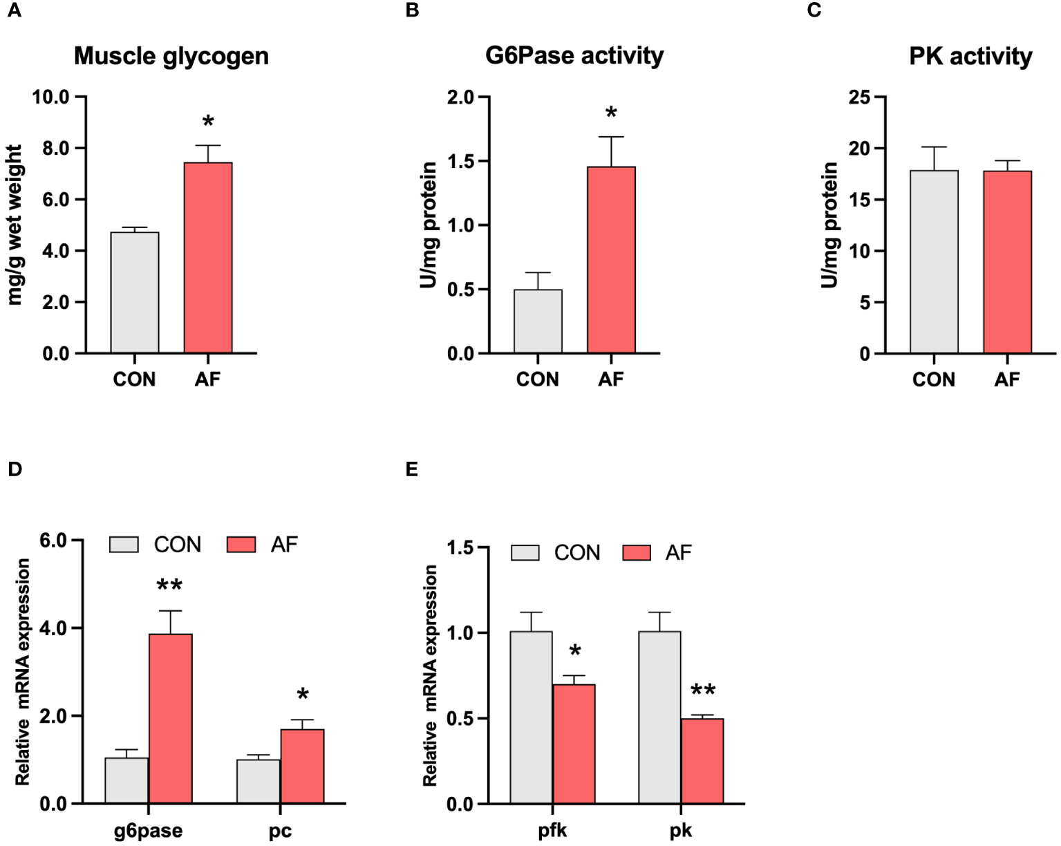 Artificial diets disrupted glucose metabolism in the muscle of mandarin fish. Muscle glycogen (A), G6pase activity (B), and PK activity (C) in the muscle of mandarin fish fed with the natural or artificial diets. Relative mRNA levels of genes related to gluconeogenesis (D) and glycolysis (E) in the muscle of mandarin fish fed with the natural or artificial diets. Data are presented as means ± S.E.M., n=4. Significance was evaluated by independent t-test (*P < 0.05, **P < 0.01). CON, feeding with live prey fish; AF, feeding with artificial diets; G6Pase, glucose-6-phosphatase; PK, pyruvate kinase; pc, pyruvate carboxylase; pfk, phosphofructokinase.