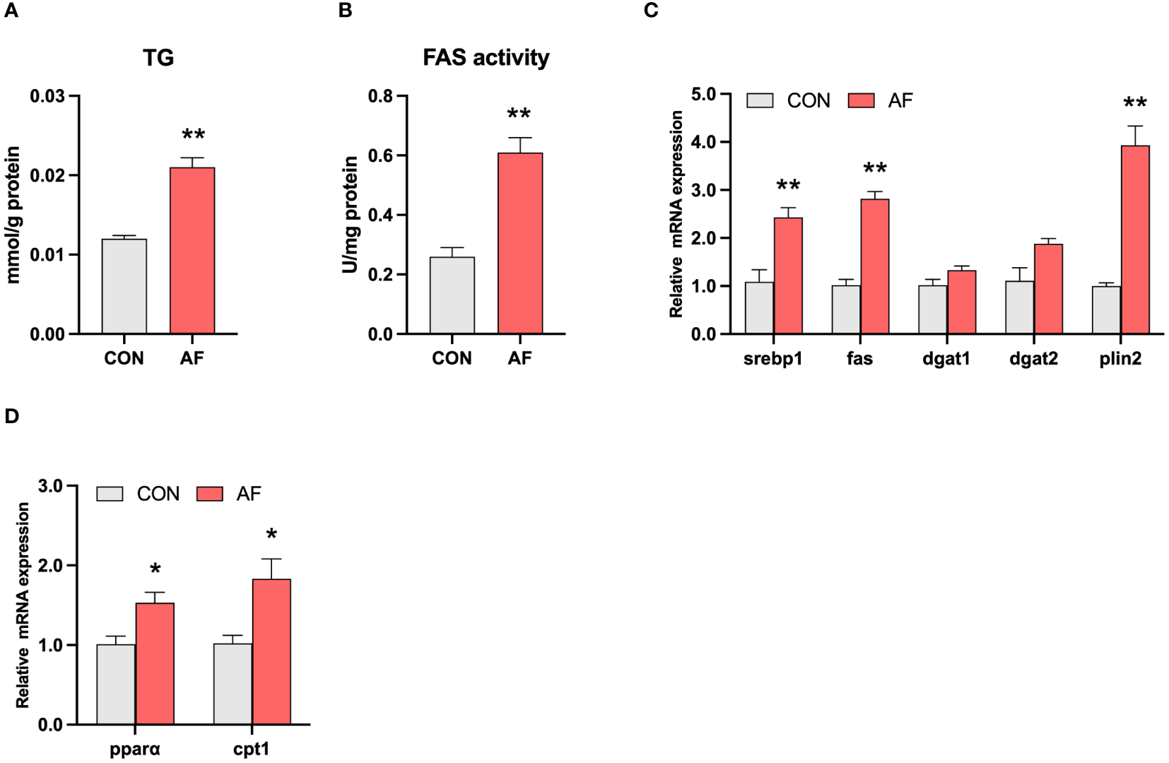 Artificial diets disrupted lipid metabolism in the muscle of mandarin fish. The level of TG (A) and the activity of FAS (B) in the muscle of mandarin fish fed with the natural or artificial diets. Relative mRNA levels of genes related to lipid synthesis (C) and fatty acid β-oxidation (D) in the muscle of mandarin fish fed with the natural or artificial diets. Data are presented as means ± S.E.M., n=4. Significance was evaluated by independent t-test (*P < 0.05, **P < 0.01). CON, feeding with live prey fish; AF, feeding with artificial diets; TG, triglyceride; FAS, fatty acid synthetase; srebp1, sterol regulatory element binding protein 1; dgat1, diacylglycerol O-acyltransferase 1; dgat2, diacylglycerol O-acyltransferase 2; plin2, perilipin 2; pparα, peroxisome proliferation-activated receptor alpha; cpt1α, carnitine palmitoyl transferase 1 alpha.