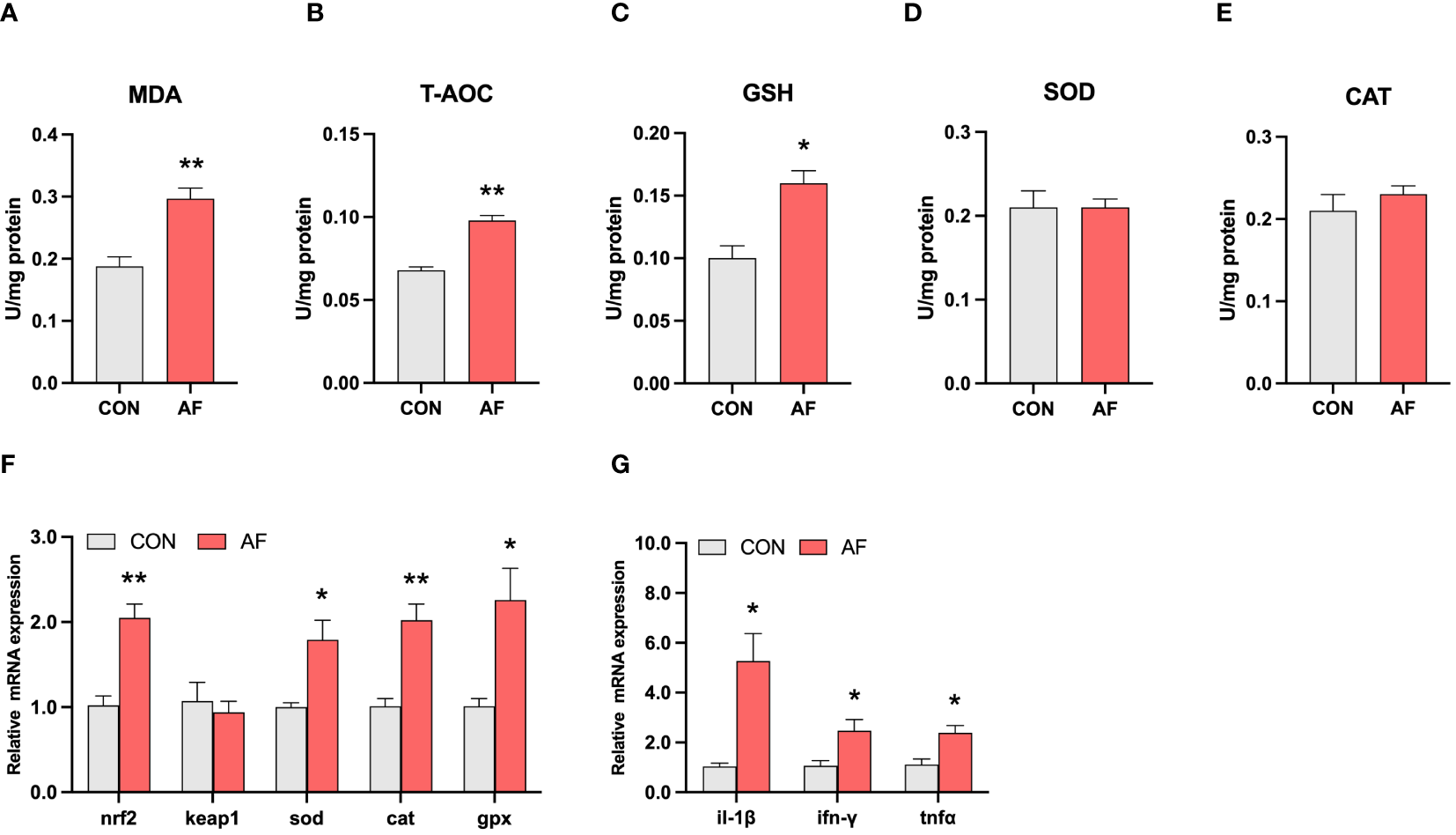 Artificial diets induced oxidative stress and inflammation in the muscle of mandarin fish. The levels of MDA (A), T-AOC (B), and reduced GSH (C) in the muscle of mandarin fish fed with the natural or artificial diets. The activities of SOD (D) and CAT (E) in the muscle of mandarin fish fed with the natural or artificial diets. Relative mRNA levels of genes related to antioxidative stress (F) and proinflammation cytokines (G) in the muscle of mandarin fish fed with the natural or artificial diets. Data are presented as means ± S.E.M., n=4. Significance was evaluated by independent t-test (*P < 0.05, **P < 0.01). CON, feeding with live prey fish; AF, feeding with artificial diets; MDA, malondialdehyde; T-AOC, total antioxidant capacity; GSH, reduced glutathione; SOD, superoxide dismutase; CAT, catalase; nrf2, nuclear factor erythroid2‐related factor 2; keap1, Kelch-like ECH-associated protein 1; sod, superoxide dismutase; cat, catalase; gpx, glutathione peroxidase. il-1β, interleukin 1 beta; ifn-γ, interferon gamma; tnfα, tumor necrosis factor alpha.