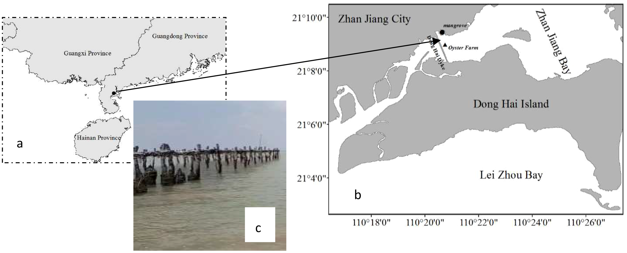 (A) Location of Zhanjiang Bay in China; (B) location of sampling sites within the Bay; (C) photograph of oyster cultivation conducted by inserting into the sediments.