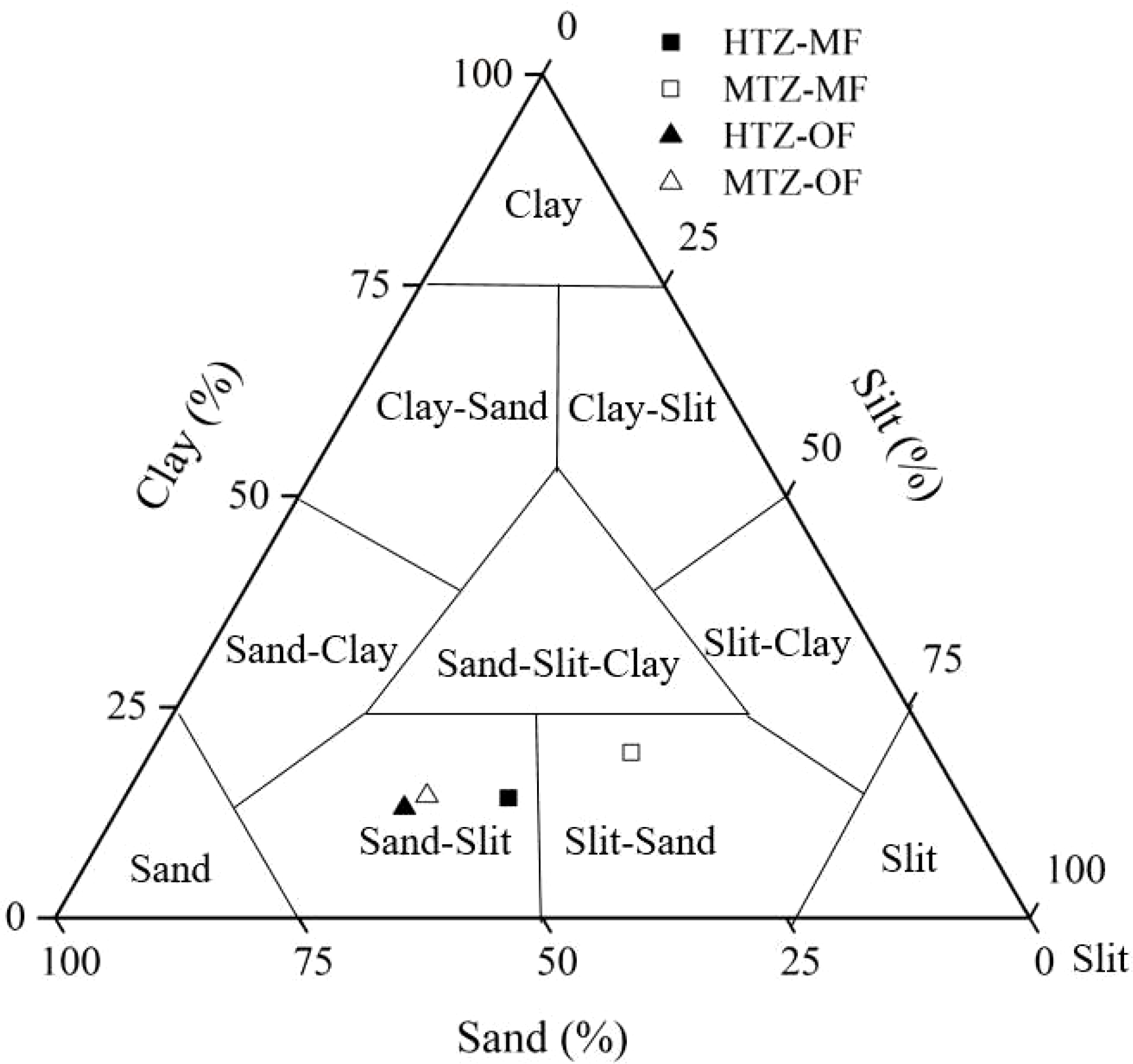 Texture of the sediments sampled within the study area. The position of each symbol in the triangle diagram is determined by the average value of the granularity.