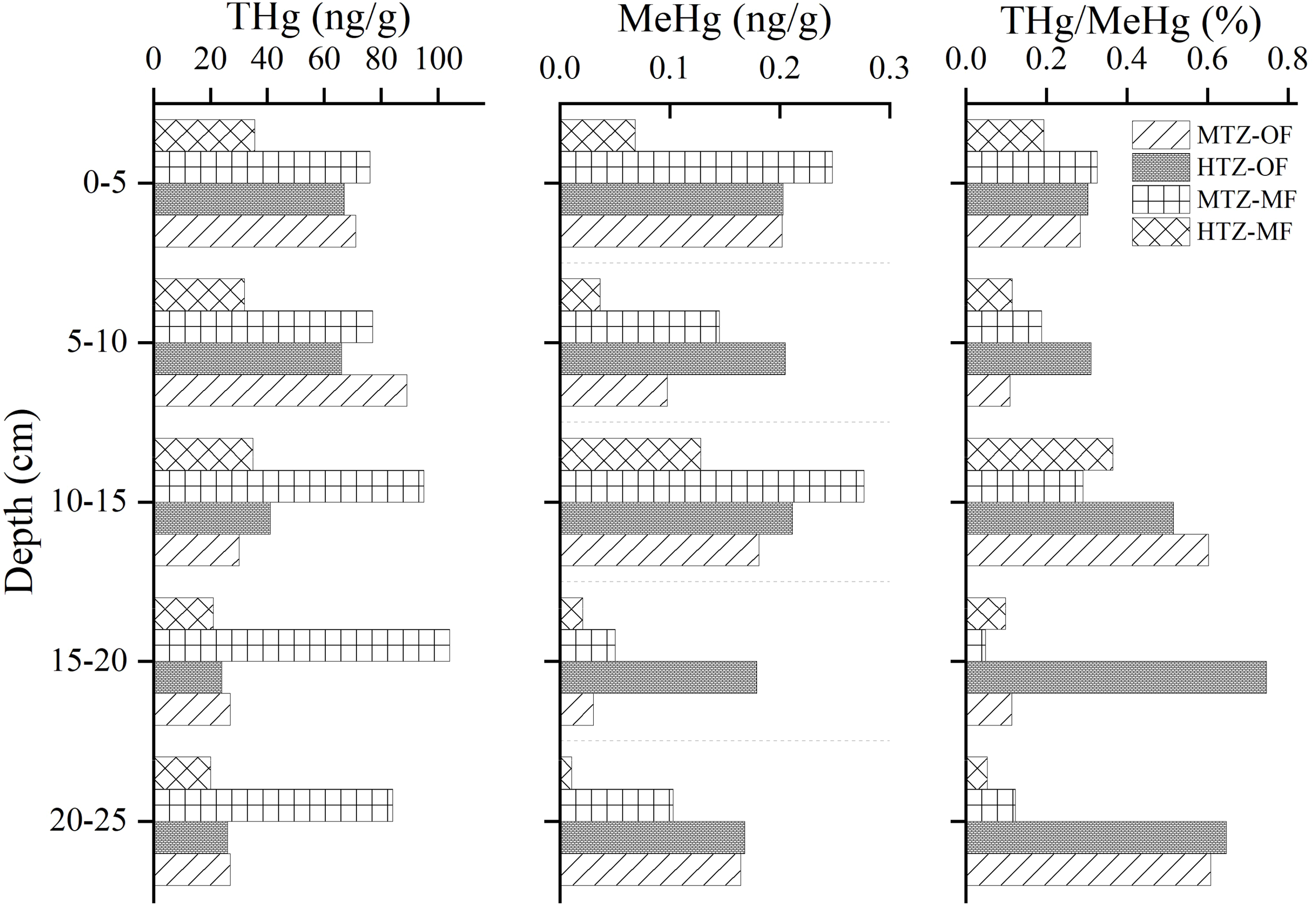 Concentrations of MeHg ranged from 0.011~0.128 ng/g. Spatially, MeHg at site HTZ-MF exhibited a vertical trend similar to that of THg, with the exception of a peak in concentration at a depth of 10–15 cm (Figure 3). Concentrations of MeHg above the peak are slightly higher than those below the peak. A predominance of MeHg in the surface sediment is consistent with the results of Sunderland et al. (2006) who found that MeHg production occurred mainly in the approximately 15 cm thick, active surface layer (Sunderland et al., 2006).MeHg concentrations in the MTZ-MF ranged from 0.05 to 0.277 ng/g; the maximum concentrations being more than twice as high as was found at site HTZ-MF. However, the maximum MeHg concentration at site MTZ-MF was found at a depth of 10–15 cm, as it was at site HTZ-MF. Presumably, this depth interval at both sites provided the most suitable conditions for SRB to participate in methylation reactions (Benoit et al., 1999). As shown in Figure 3, the MeHg content ranged from 0.168–0.211 ng/g at site HTZ-OF. The maximum concentrations of MeHg are about twice as high as those observed at site HTZ-MF.