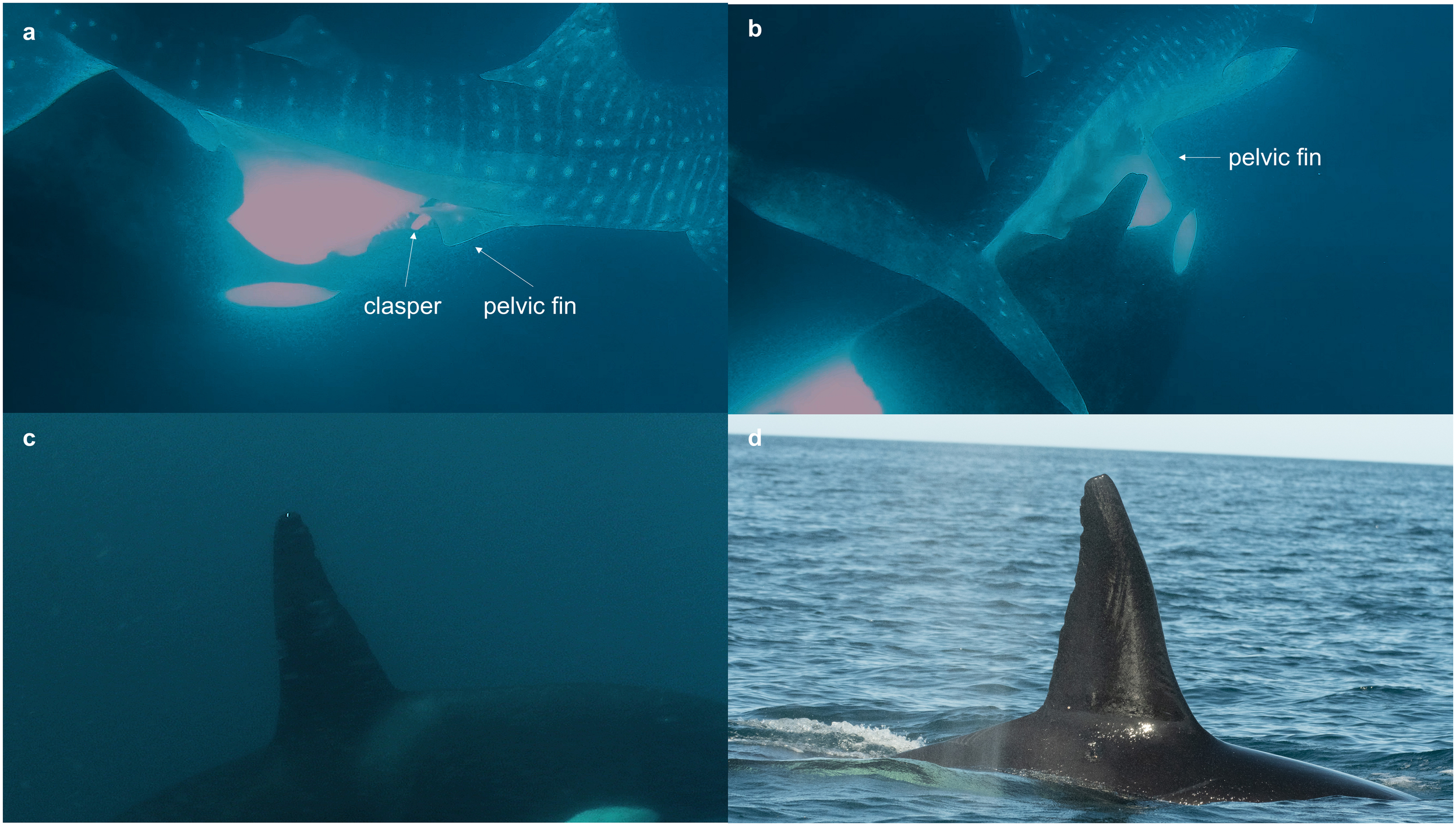 Sequence of killer whale attack on whale shark on 27 April 2023. (A) killer whale biting the clasper (B) and the pelvic fin of the whale shark. (C, D) “Moctezuma”, the adult male of the pod is identified as one of the killer whales involved in the attack. Photo credits: James Moskito.