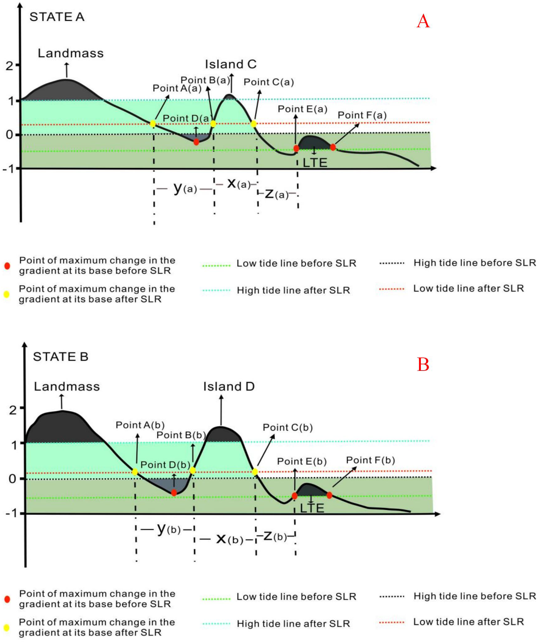 In short, the LTE is submerged totally, and after SLR, the original furthest Point F(a) disappears for State A as well as Point F(b) for State B. The area of maritime zones for which State A can claim is likely to change obviously, especially the legal attributes of the water area between the landmass and the island. By contrast, concerning the claimed area of maritime zones, State B with the steep slope is affected by the SLR much less than State A with the gentle slope.9 The decreased projecting areas of State A and State B depend on the distance that the baselines retreat.