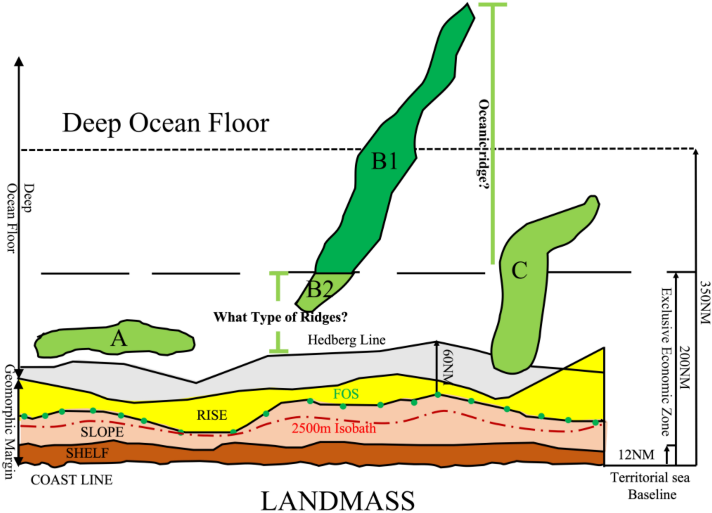The concept of the foot of the slope (FOS) is set out in paragraph 4(b) of Article 76 in the Convention. Meanwhile, Article 76 provides no specific maximum extent to the continental margin. Its outer edge is established by measurements based on the FOS envelop (Brekke and Symonds, 2011). The CS, however, is subject to maximum constraints as provided for in paragraph 5 of Article 76. The basis here is the geographical location from the continental slope to the continental rises within the whole continental margin. The area of the continental margin comprises the submerged prolongation of the landmass and consists of the seabed and subsoil of the shelf, the slope, and the rise, including the submarine elevations. As per Article 76(5) of the Convention, the outer limit of the CS can extend up to 350 NM from the baseline around what are referred to as “submarine ridges”. However, what is commonly referred to as an “oceanic ridge” encompasses features like “submarine elevations,” such as plateaus, rises, caps, banks, and spurs as stipulated in Article 76(6), and “oceanic plateau” in Article 47(7), none of which contribute to the natural prolongation for the FOS.