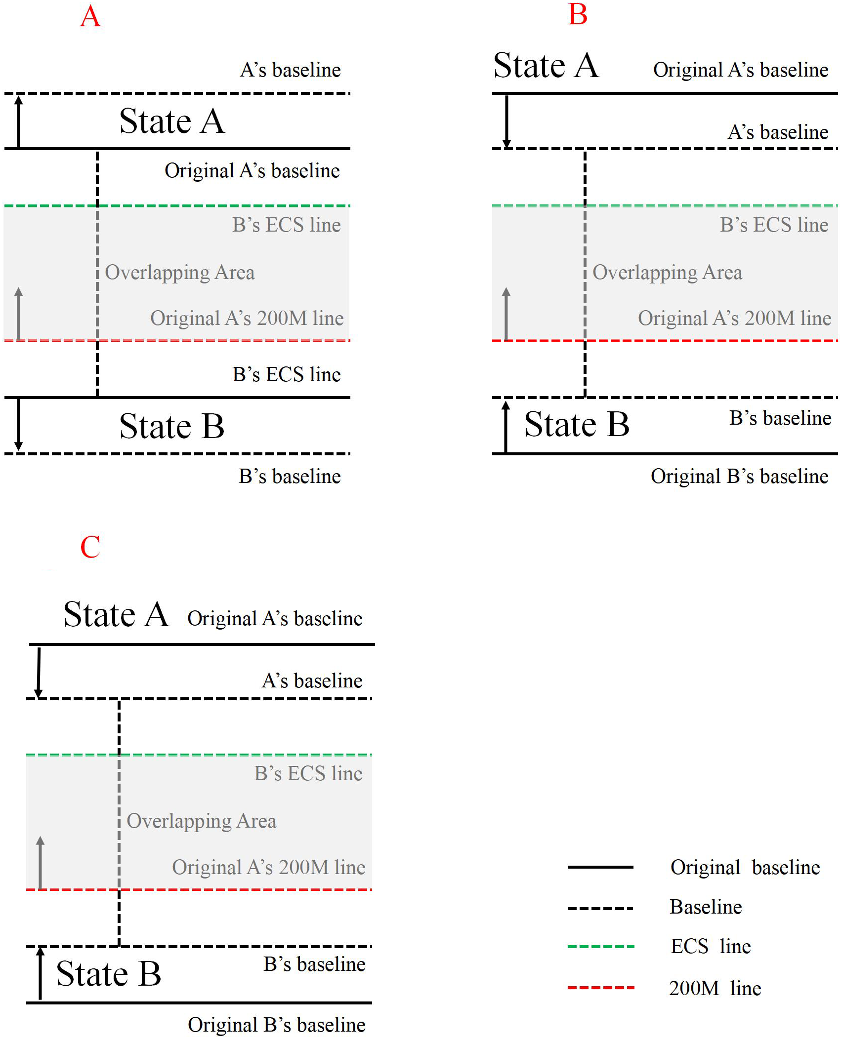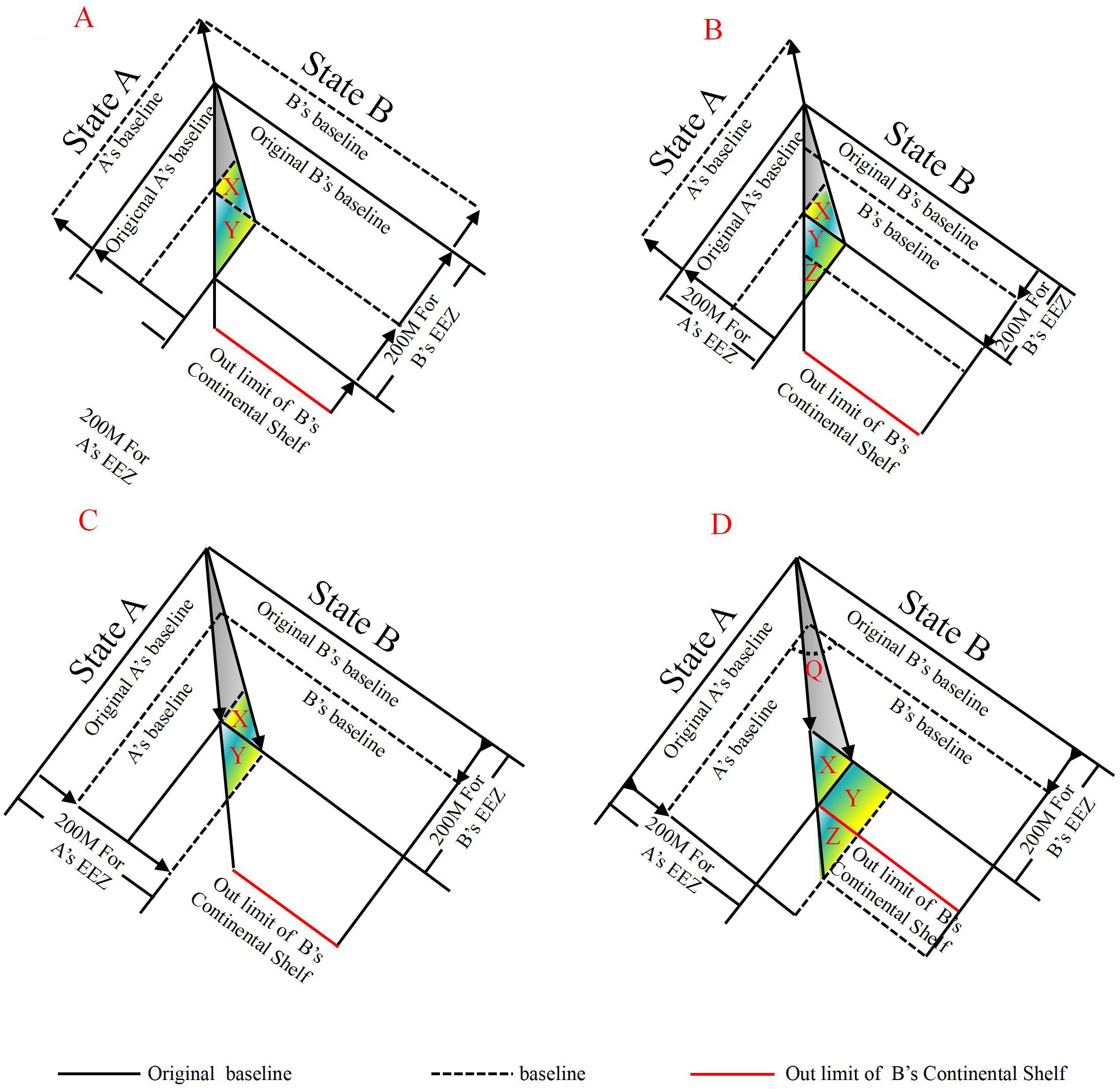 In Figure 4C, the superjacent water between EEZ areas is the high sea, and the corresponding seabed and subsoil are either the outer CS of State B or the international seabed. Once the coastlines of State A and State B move seaward, the direction of the 200- NM lines for two states will move along with their baselines. In addition, the outer limit line of State B will be stable unless the foot of the slope needs to be re-identified. Thus, the reduced distance of the high sea’ s width is equal to the sum of the distance that the two baselines move, whereas the reduced width of the international seabed is expected to be less than the altered width of the high sea.
