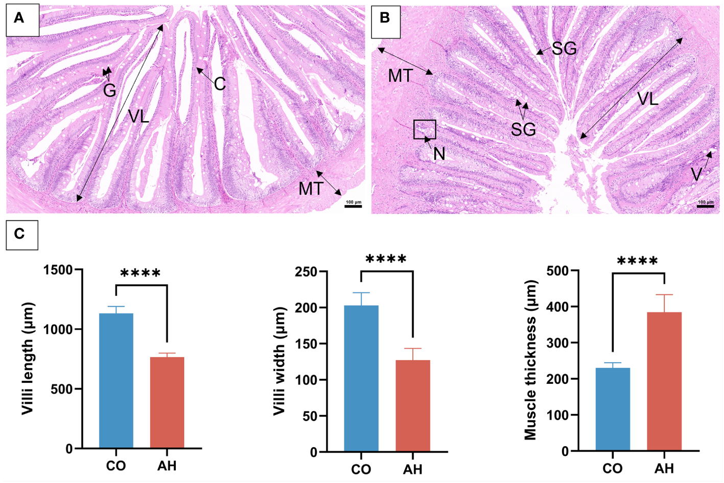 Histological changes in the intestine after acute heat stress. (A): CO group. (B): AH group. (C): The intestine morphological index measurement. G, goblet cell; C, columnar cells; N, necrosis; V, vacuolization; SG, swollen goblet cell; lV, villi length; MT, muscle thickness. Scale bar: 100 μm. “****” represents P<0.0001.