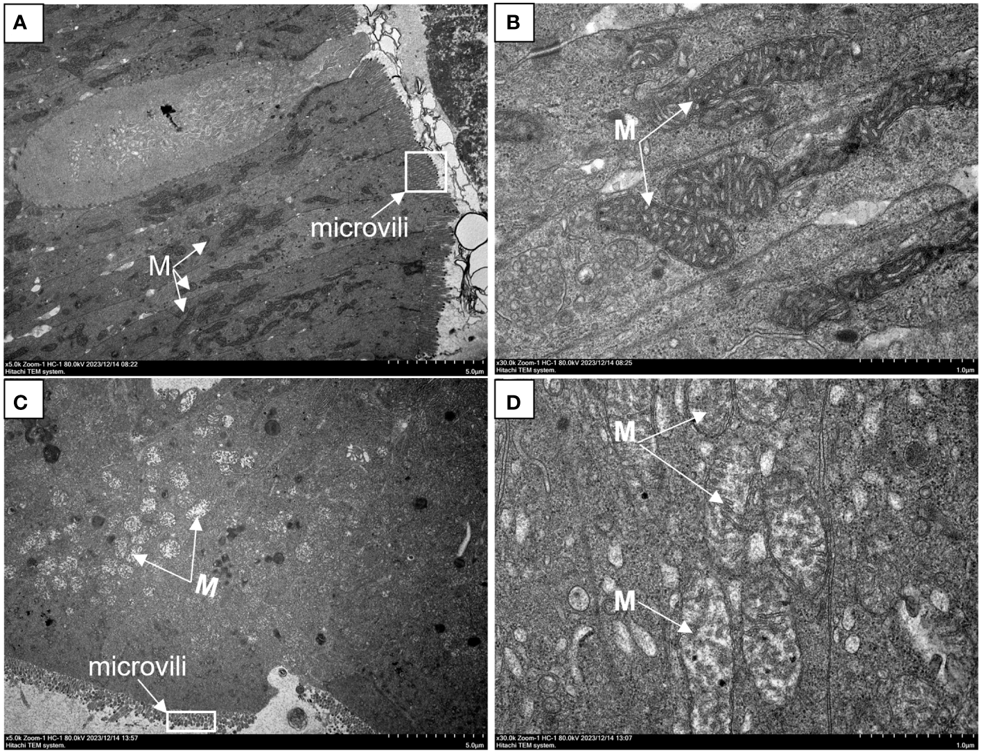 Changes in the intestinal ultrastructure of G eckloni in the CO group compared to the AH group. (A, B): CO group. (C, D): AH group. M: mitochondria.