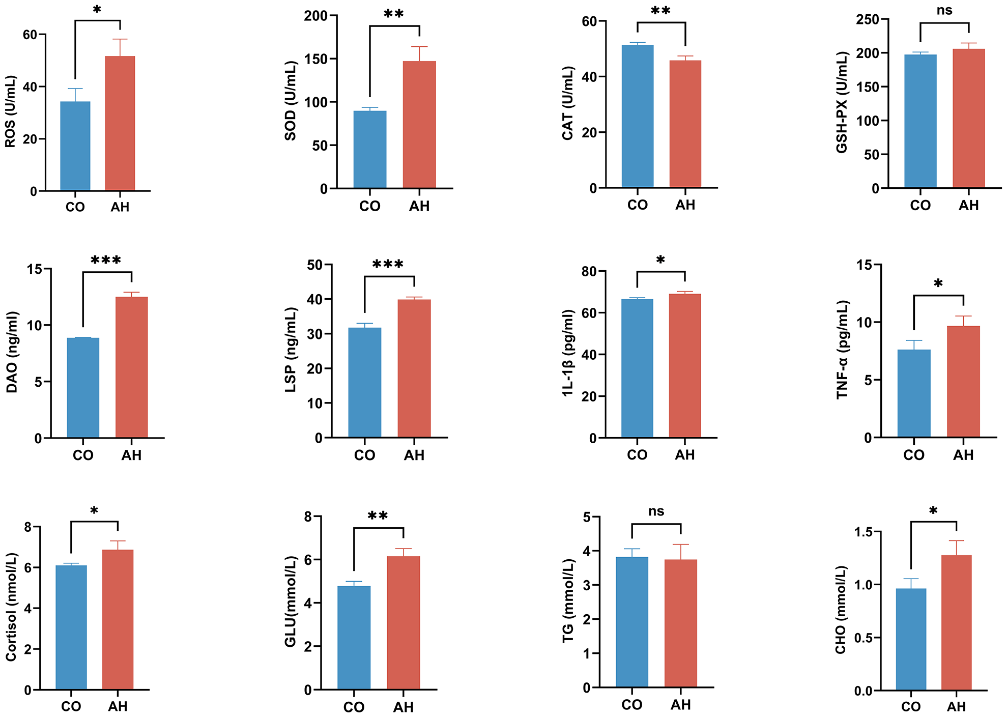 All data are presented as mean ± SD. Data were processed and plotted using SPSS 26.0 (SPSS Inc., Chicago, USA) and GraphPad Prism 9.5 (GraphPad Software Inc., CA, USA). Differences between the CO and AH groups were determined using a t-test. A significance level of P < 0.05 was considered statistically significant, P < 0.01 was considered highly significant, and P < 0.001 was considered extremely significant.