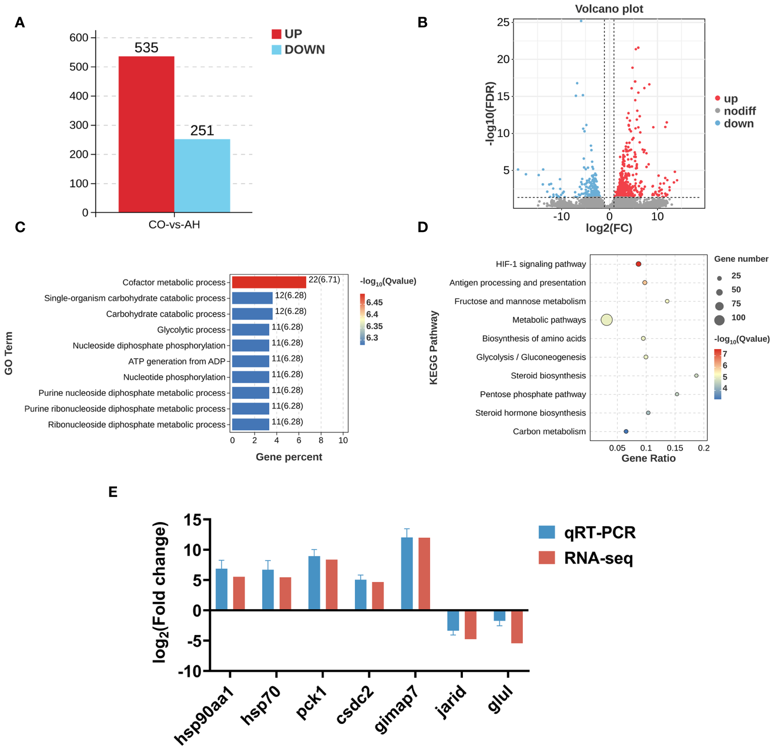 Effect of acute heat stress on the transcriptome. (A): The numbers of DEGs between the CO and AH groups. (B): A volcano map. (C): A bar chart of the top 10 significantly enriched GO terms. (D): A bubble diagram of the top 10 significantly enriched KEGG pathways. (E): Validation of qPCR.