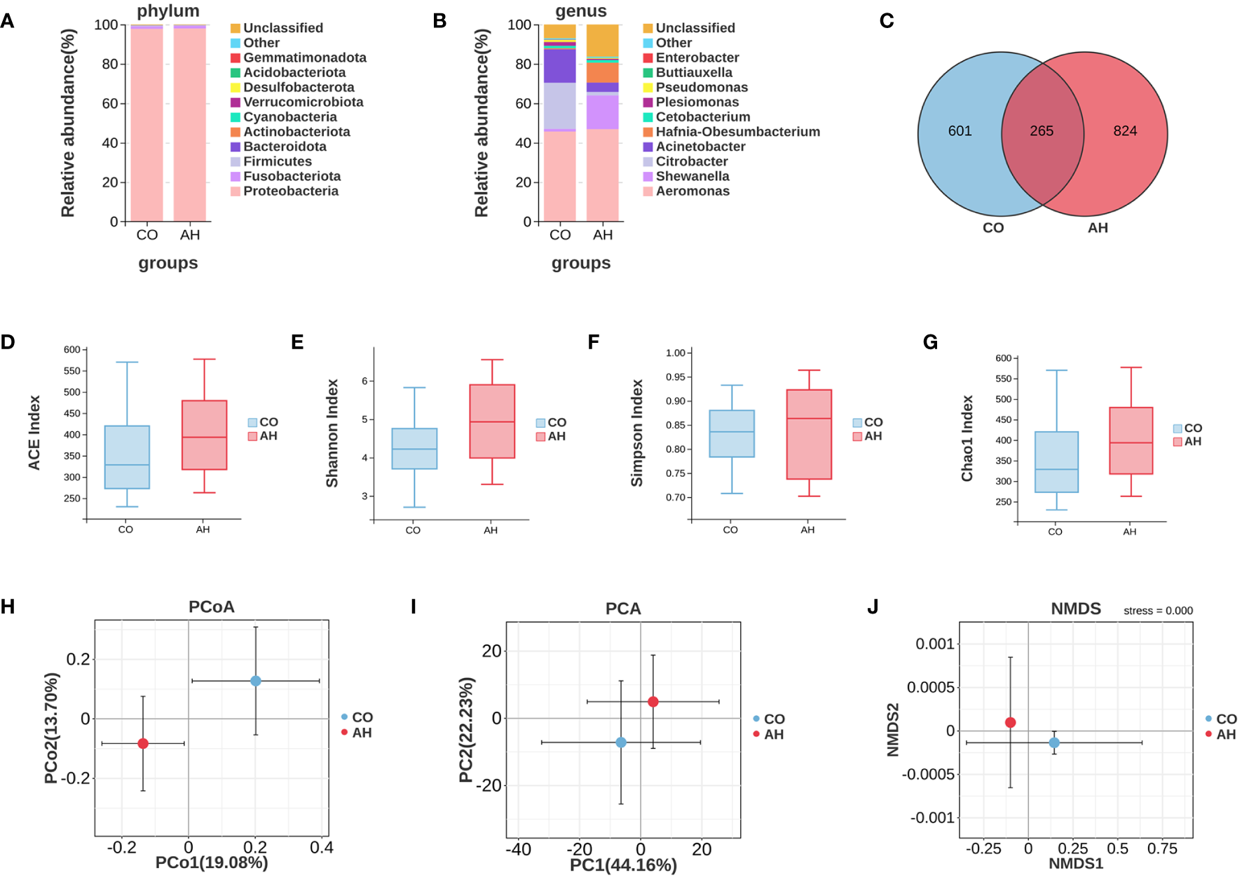 The alpha diversity analysis (Figures 6D-G) revealed that the differences in diversity indices, including Chao1, Shannon, Simpson, and ACE, between the CO and AH groups were not statistically significant, indicating that acute heat stress had a minimal effect on the diversity of the intestinal microbiota in G. eckloni. In contrast, the beta diversity analysis (Figures 6H-J) showed clear separation between the CO and AH groups on the two-dimensional coordinate plots of PCoA, PCA, and NMDS, suggesting that acute heat stress significantly affected the composition of the intestinal microbiota in G. eckloni.