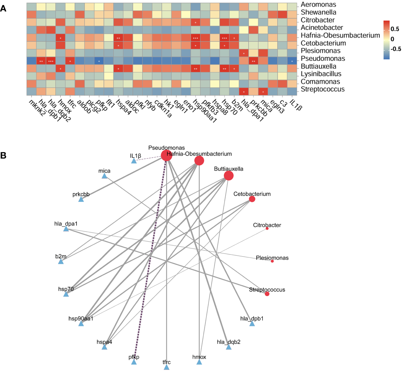 Correlation between the intestinal microbiota and DEGs. (A): Correlation heatmap. The X-axis represents the selected DEGs, the Y-axis represents the microbiota, and the color indicates the strength of the correlation. Statistical significance was defined as *P < 0.05, **P < 0.01, and ***P < 0.001. (B): Network diagram: Full lines denote positive correlations and dotted lines denote negative correlations. Line thickness represents the strength of the correlation.