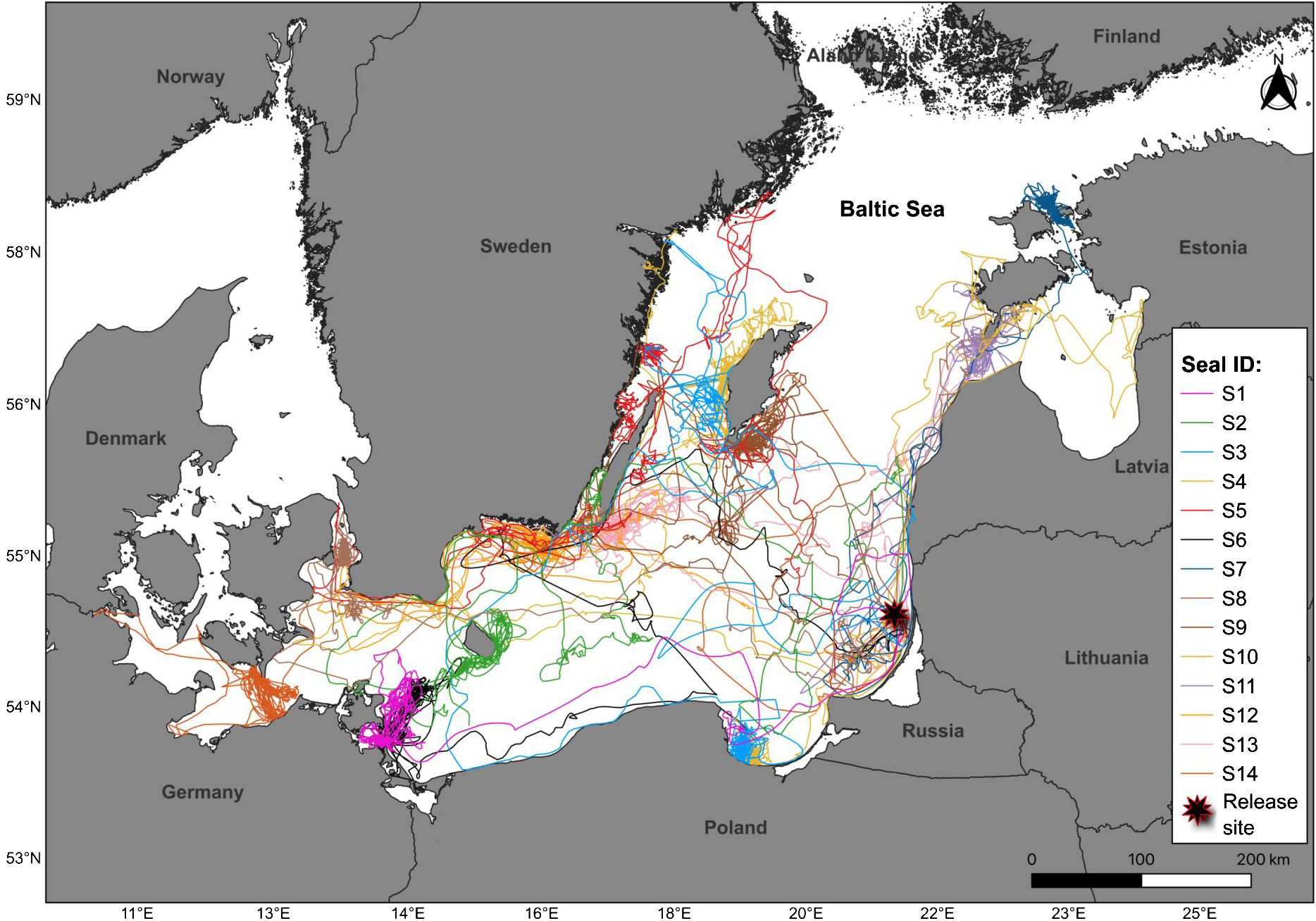 Seal juveniles dispersed widely across the Baltic Sea and showed a high inter-individual variability in directionality, but there were a few main areas targeted, including the north-eastern, southern and south-western parts of the Baltic Sea (Figure 1). Until the tags stopped transmitting, S3 and S4 - were in the bay of Gdansk near Poland, S1 and S6 - in the bay of Greifswald near Germany, S14 – in the bay of Mecklenburg near Germany and Denmark, S8 – the Öresund between the Danish and Swedish coasts, S2 – near the island of Bornhlom, S9 and S10 - near the Swedish island Gotland, S13 – near the island of Öland, S12 and S5 – in the bay of Hanö and south-eastern coast of Sweden, S7 and S11 – near the islands of Estonia, including Saaremaa, Hiiumaa and Vormsi. None of the juveniles appeared near the coasts of Lithuania, Latvia, Finland and Russia until the tags stopped transmitting.