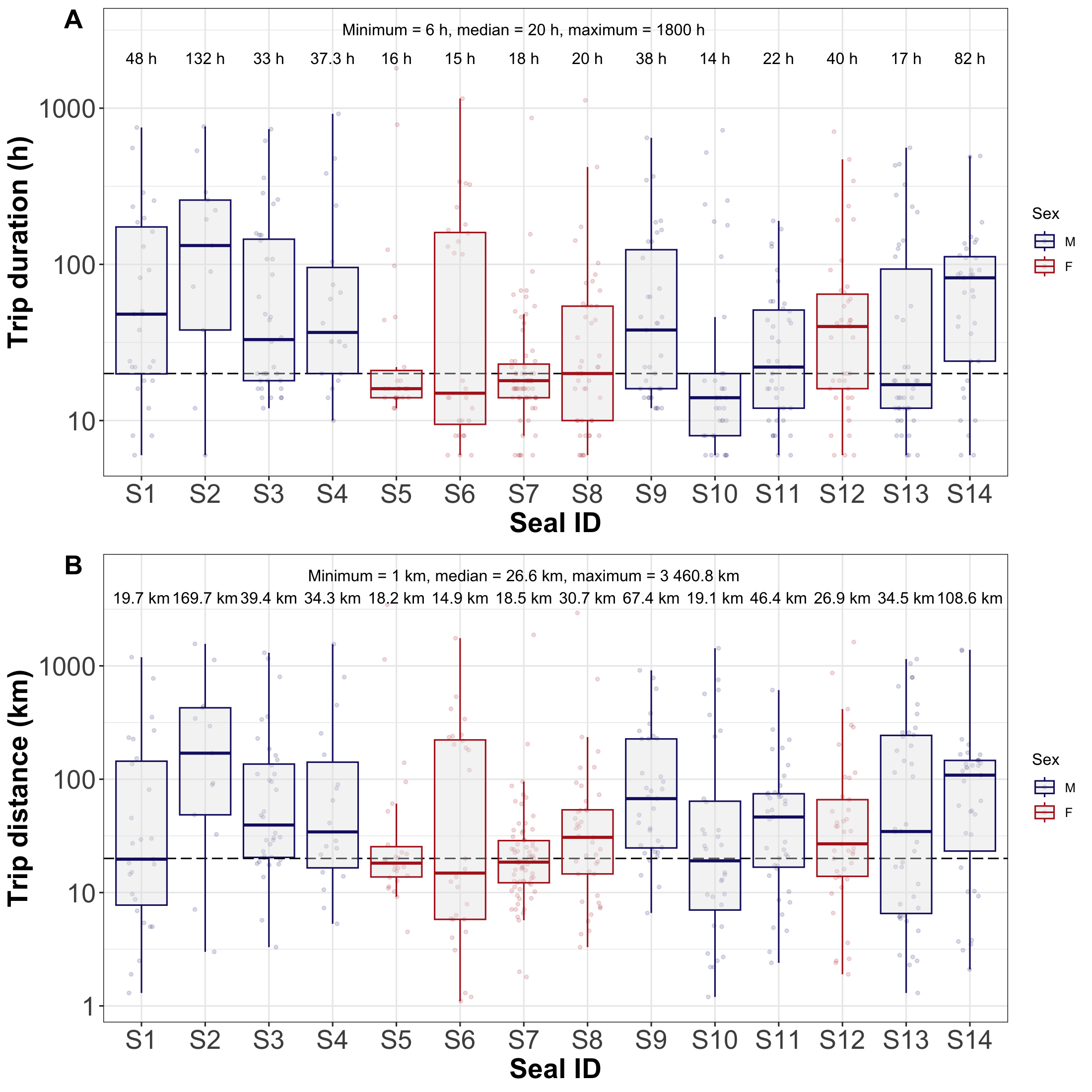 Box plots showing the duration (A) and distance (B) of trips for each individual disaggregated by sex. Median values of each individual are represented at the upper part; overall minimum, median and maximum values are shown in the top-centre of box plots. Black dashed line shows overall median value. The values on the y-axis were log-transformed in order to account for outliers and achieve a better data visualisation.