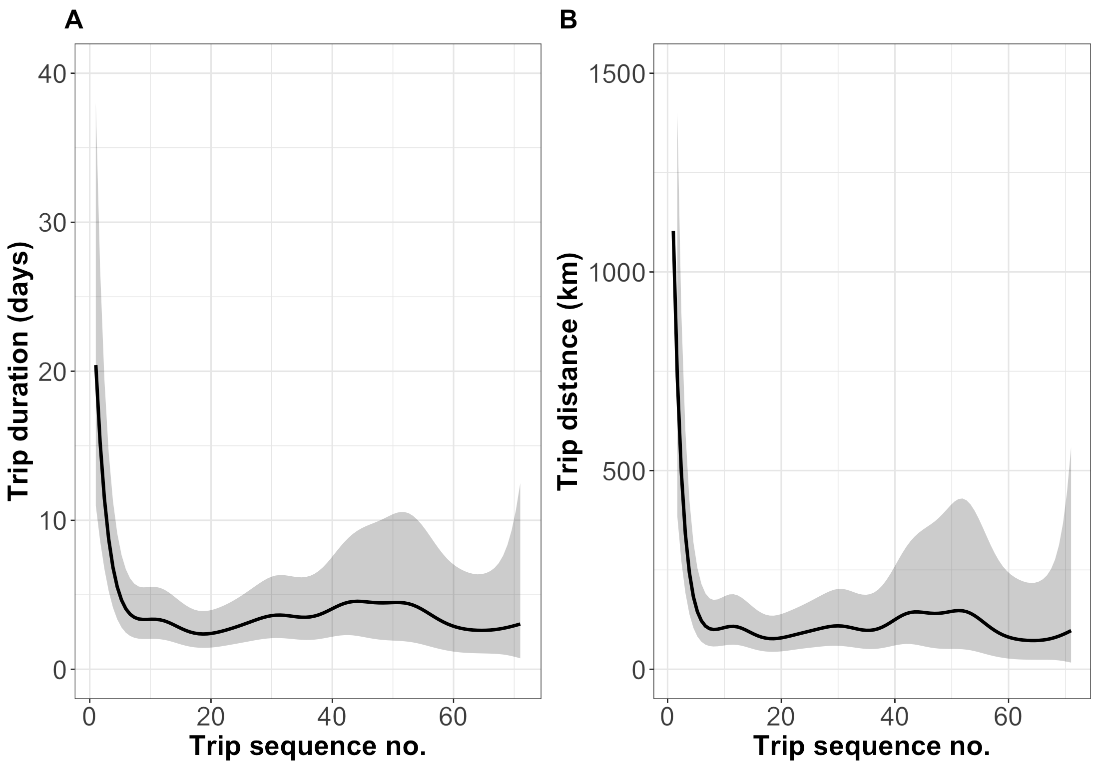 Model-predicted development of trip duration (A) and distance (B) over time, represented as number of trips since release. Solid lines show population mean responses, with associated GAMM-based 95% confidence intervals (shaded areas).