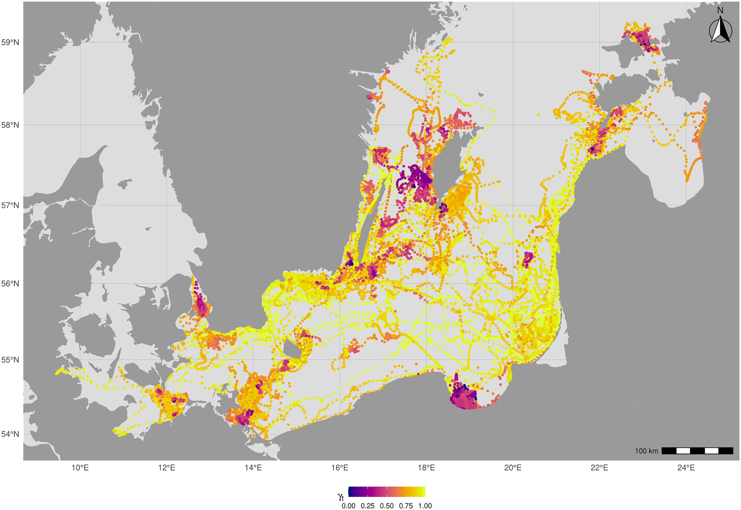 Map showing the behavioral state of rehabilitated grey seal pups in the Baltic Sea. The state was characterised by the γt value: lower values indicate resident areas, higher values indicate transit areas. Visualisation was done in R 4.3.2 using R studio 2023.12.0.369 for macOS (https://cran.r-project.org/bin/macosx/).