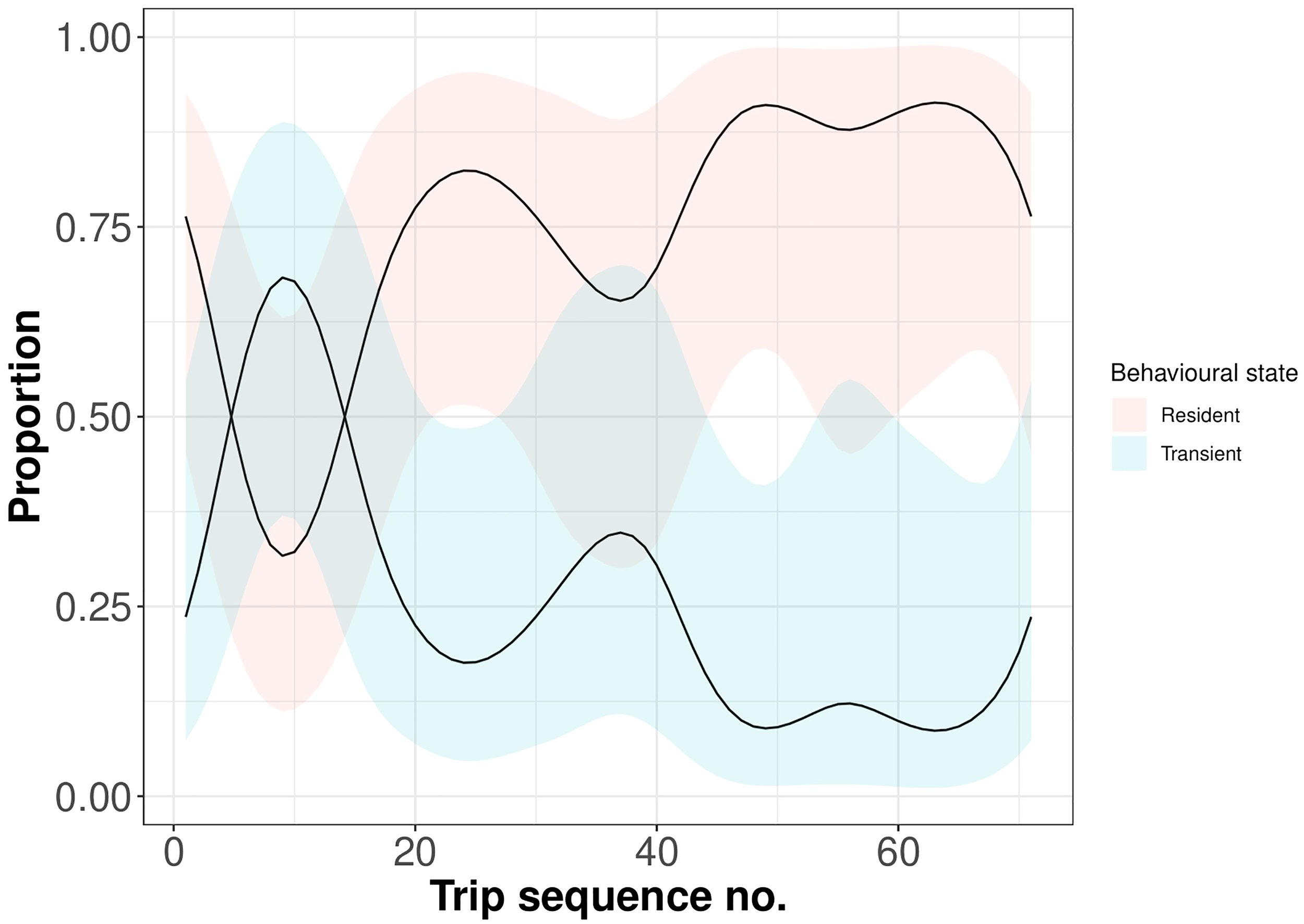 Statistical analysis showed that release year and sex had no significant effect on the ontogeny of behavioural states of rehabilitated seals. There was also no effect of the interaction between sex and trip sequence number. However, similarly as in the case of trip characteristics, trip sequence number significantly affected the probability of behavioural states (F=8.61, p<0.0001) (Figure 5). As predicted by the model, the patterns of behavioural states changed rapidly. By the 10th trip, the proportion of transient movements reached a maximum, subsequently declining, while the proportion of resident movements reached a minimum, subsequently increasing. After the 20th trip, a stable pattern of mostly resident movements and few phases of transient movements seemed to be established.