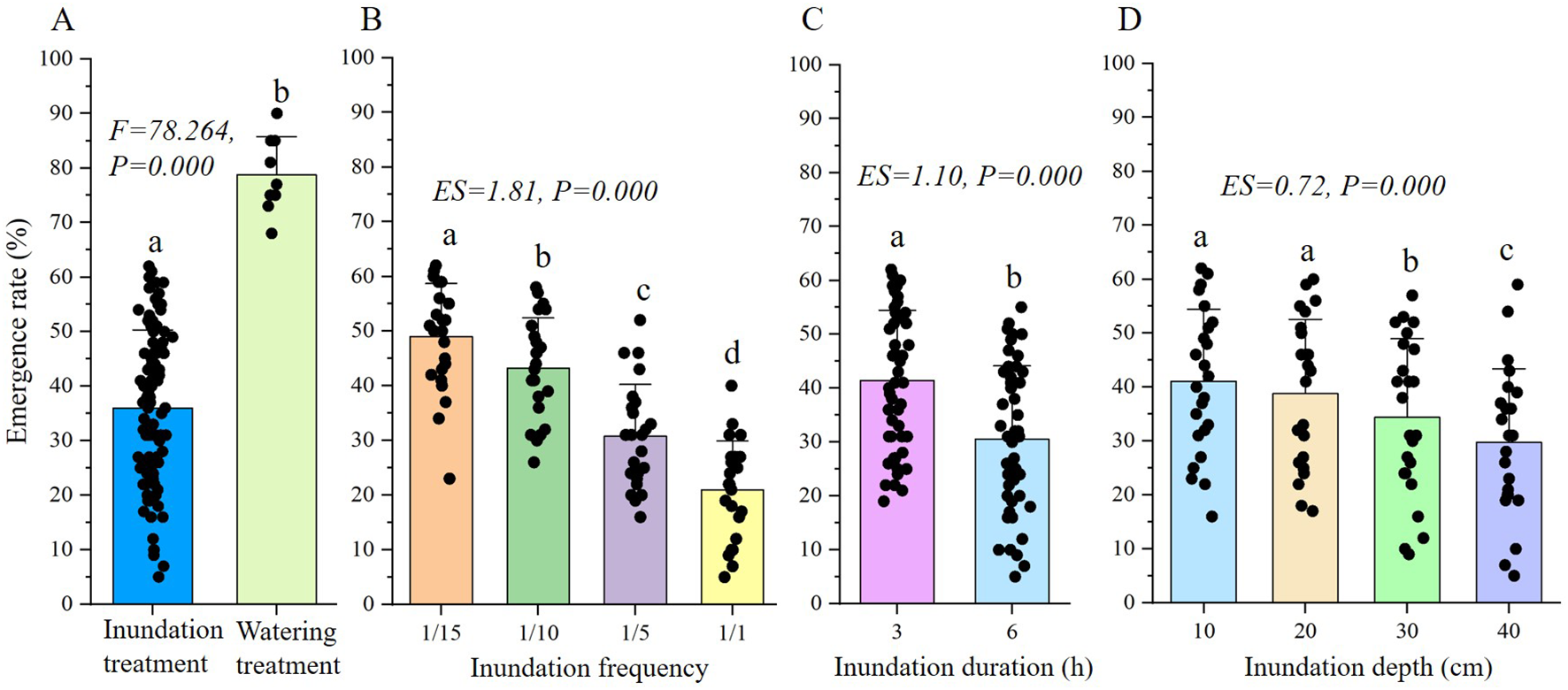 ANOVA analysis of total emergence rate of S. salsa seeds under different treatment. (A) shows the result of one-way ANOVA of inundation and watering treatment, (B-D) show the results of three-way ANOVA of frequency, duration and depth in inundation treatment. The same letter above the bar shows no significant differences.