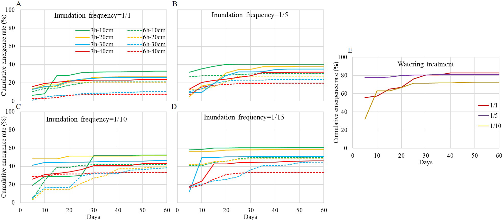 S. salsa emergence curve during the experiment. (A-D) are inundation treatment with frequency at 1/1, 1/5, 1/10 and 1/15, respectively. Each full line with different color shows inundation event of 3h-duration with different depth, and each dash line with different color shows inundation event of 6h-duration with different depth. (E) is watering treatment with watering frequency at 1/1, 1/5 and 1/10, respectively.