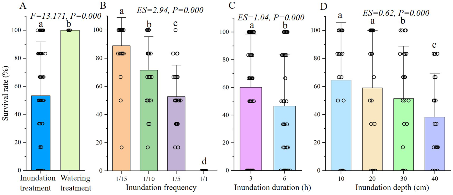 ANOVA analysis of final survival rate of S. salsa seedlings under different treatment. (A) shows the result of one-way ANOVA of inundation and watering treatment, (B-D) show the results of three-way ANOVA of frequency, duration and depth in inundation treatment. The same letter above the bar shows no significant differences.