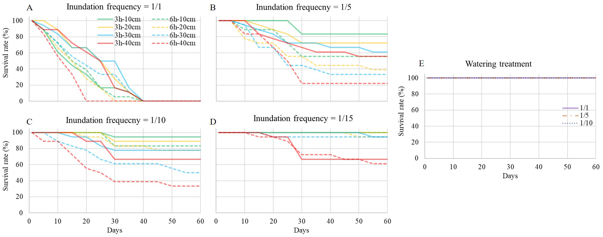 S. salsa survival curve during the experiment. (A-D) are inundation treatment with frequency at 1/1, 1/5, 1/10 and 1/15, respectively. Each full line with different color shows inundation event of 3h-duration with different depth, and each dash line with different color shows inundation event of 6h-duration with different depth. (E) is watering treatment with watering frequency at 1/1, 1/5 and 1/10, respectively.
