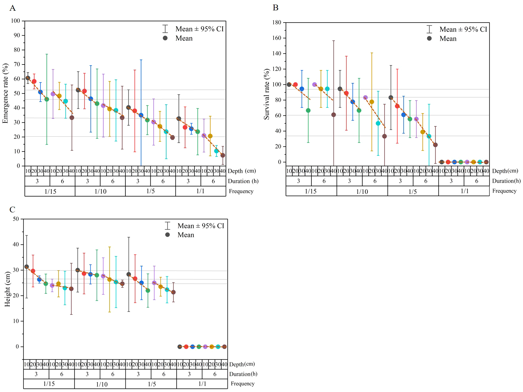 Mean values of emergence rate (A), survival rate (B) and height (C) in each frequency-duration-depth group. Dash lines are used to reveal the trend of emergence rate, survival rate and height along water depth gradient in each frequency-duration group, and grey full lines are used to reveal equal values and the corresponding inundation groups.