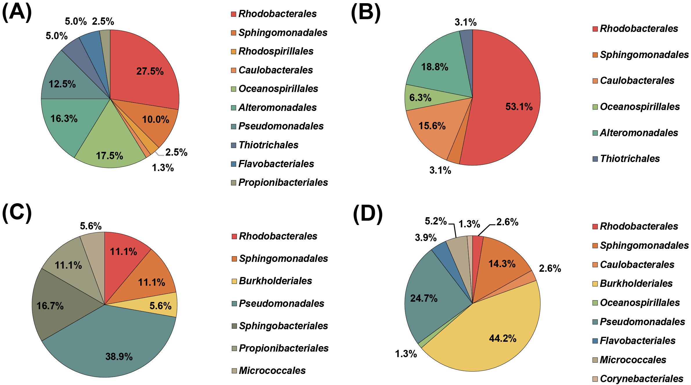 Order-level taxonomic distribution of bacterial isolates cultured from various depths at station S1 in the Northwest Pacific Ocean. Each pie chart represents results from different depths: 1000 m (A), 2000 m (B), 3000 m (C), and 4000 m (D).