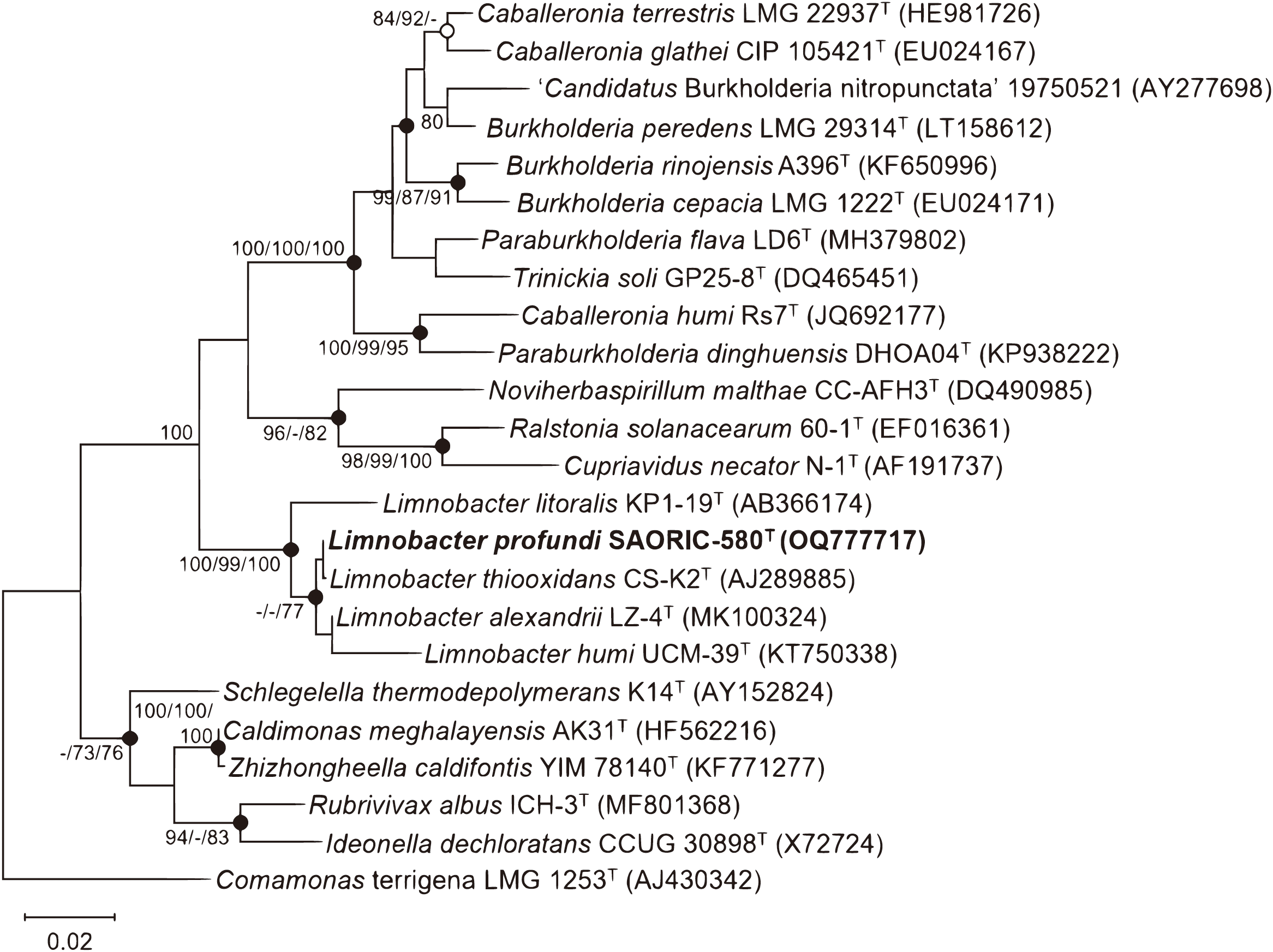 Maximum-likelihood phylogenetic tree based on 16S rRNA gene sequences showing the position of strain SAORIC-580T. Numbers at nodes represent bootstrap percentages (above 70%) obtained from maximum-likelihood (ML), neighbor-joining (NJ), and minimum evolution (ME) methods, respectively (ML/NJ/ME; −, less than 70%). Filled circles indicate nodes recovered by all treeing methods; open circles indicate nodes recovered by any two of the three methods. Comamonas terrigena LMG 1253T (AJ430342) was used as an outgroup. Bar, 0.02 substitutions per nucleotide position.