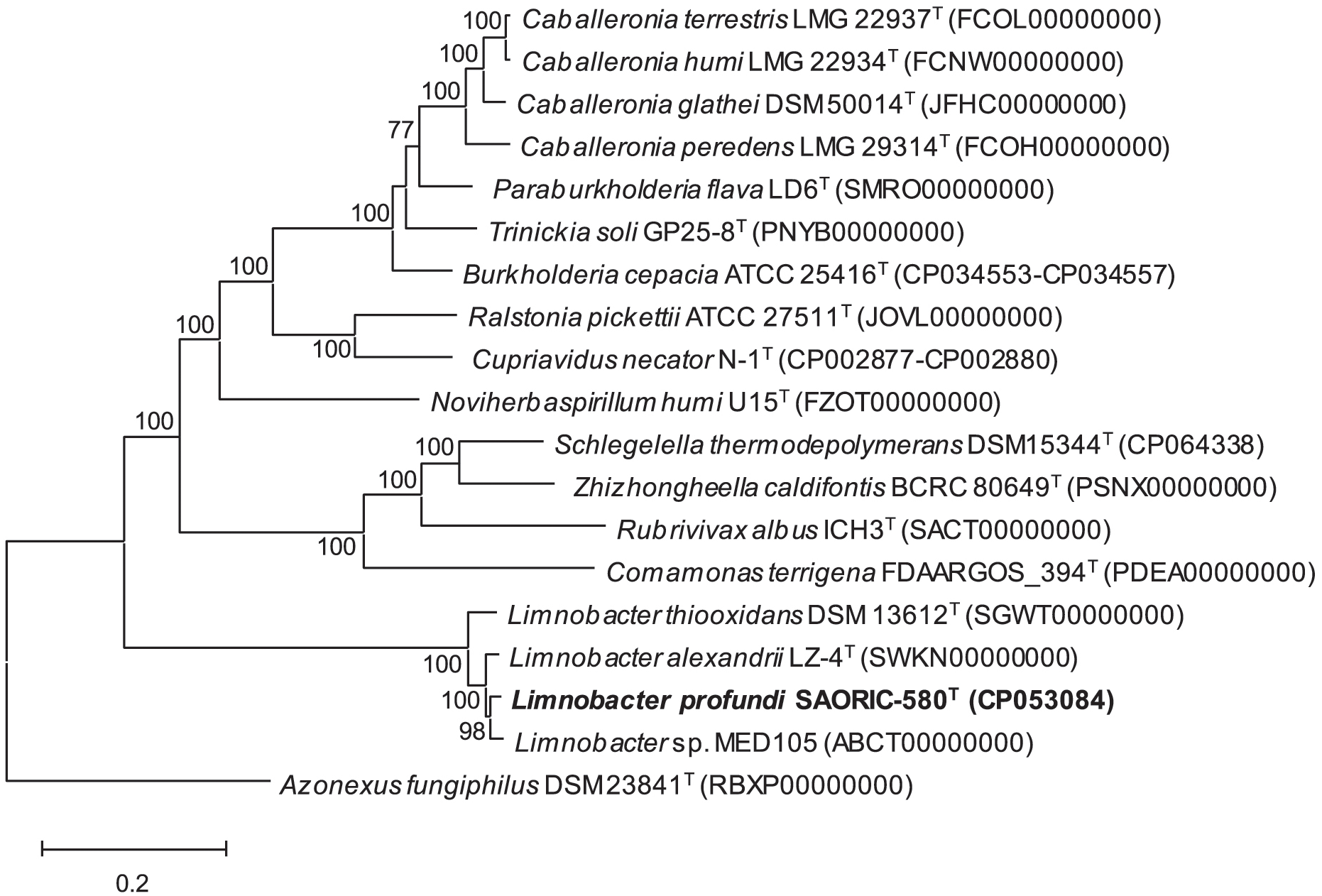 Phylogenomic tree generated using RAxML based on whole-genome sequences showing the position of strain SAORIC-580T. Values at nodes represent bootstrap support (above 70%) by RAxML. Azonexus fungiphilus DSM 23841T (RBXP00000000) was used as an outgroup. Bar, 0.2 substitutions per amino acid position.