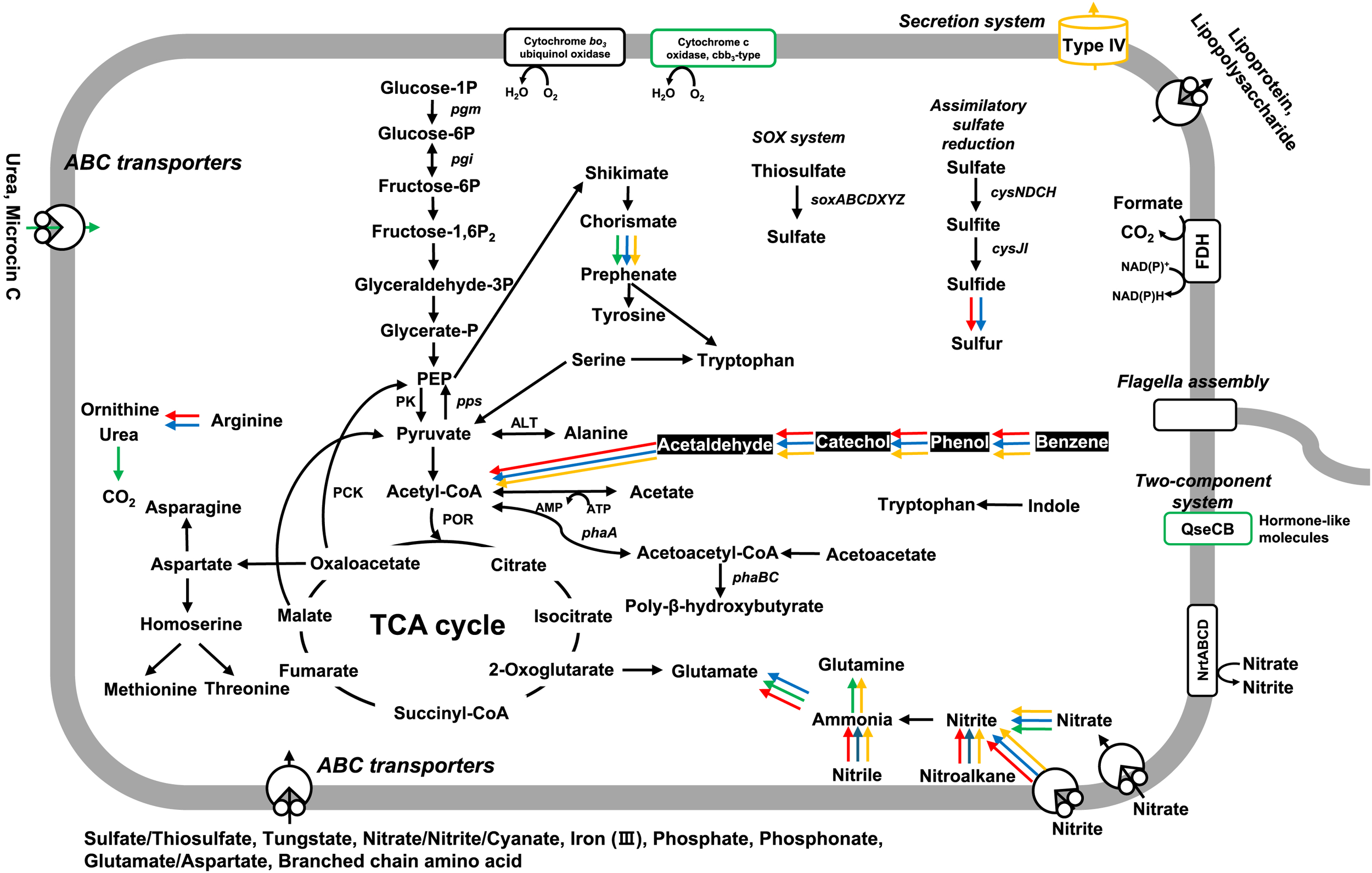 Schematic overview of predicted metabolic pathways in deep-sea Limnobacter genomes. The presence and absence of genes were predicted based on KEGG annotations. The color of the arrows indicates the presence of the corresponding gene in each Limnobacter genome as follows: Black arrow, all genomes; Red, SAORIC-580T; Green, DSM 13612T; Blue, LZ-4T; Yellow, MED105. The complete pathway for phenol degradation in marine Limnobacter genomes is highlighted with white font on a black background.