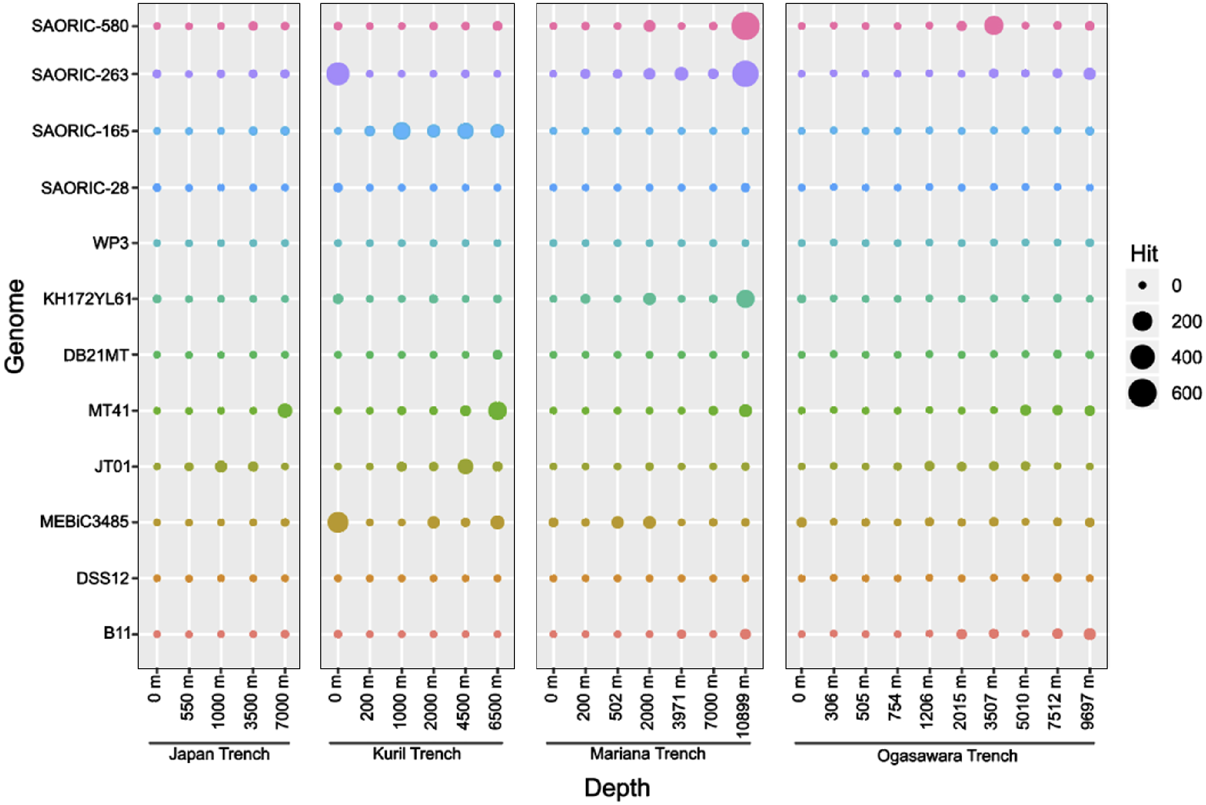 Relative abundance of deep-sea bacterial genomes analyzed by recruitment of metagenomic reads from four deep ocean trenches in the Pacific Ocean. Bubble plots show the hits of metagenomic reads from four trenches that matched genomic sequences of the deep-sea bacterial genomes. Full name of the bacterial strains: Limnobacter profundi sp. nov. SAORIC-580T, Sulfitobacter sp. SAORIC-263, Rubritalea sp. SAORIC-165, Rubrivirga sp. SAORIC-28, Shewanella sp. WP3, Psychrobacter sp. KH172YL61, Shewanella sp. DB21MT, Colwellia sp. MT41, Moritella sp. JT01, Pseudoalteromonas sp. MEBiC 03485, Shewanella sp. DSS12, and Altererythrobacter sp. B11. Bubble sizes indicate the number of metagenomic reads recruited to the genomes (y-axis).