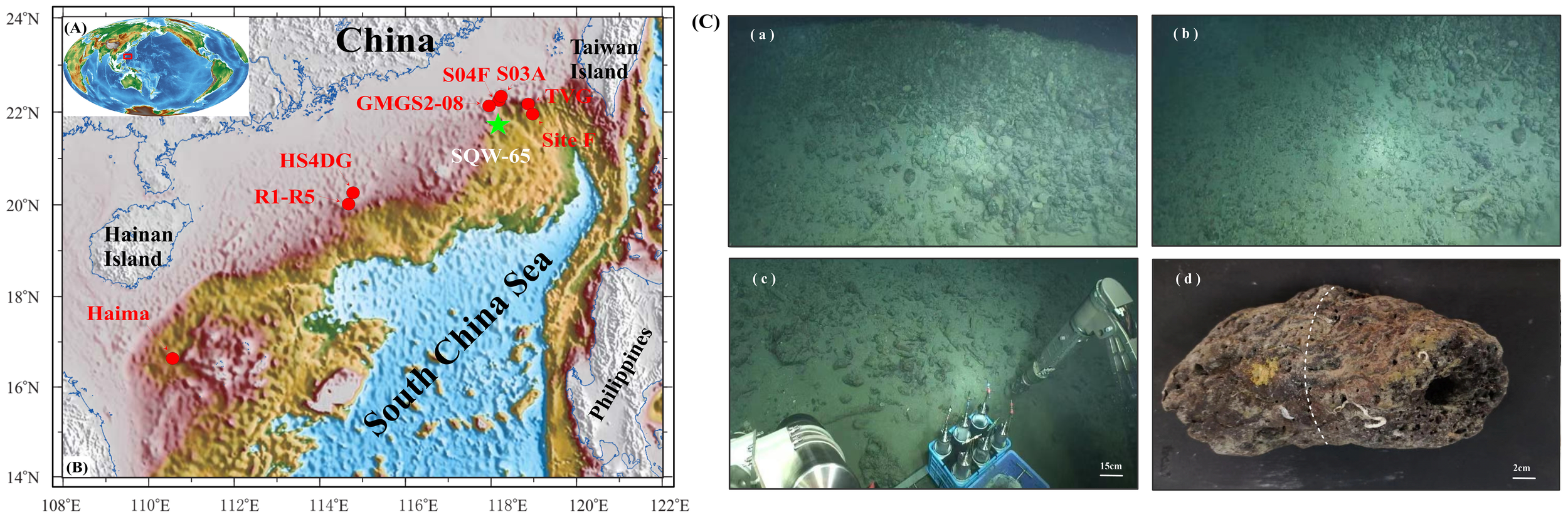 (A) Map of the world. The rectangle (red) represents the study area (B). (B) Core locations on the northern slope of the South China Sea. The green star represents the research core and the red circles represent the reference cores. SQW-65 (this study), Jiulong methane reef (TVG, Han et al., 2008; Ge et al., 2020), S03A and S04F (Yang et al., 2018), GMGS2-08 (Deng et al., 2021), Site F (Feng and Chen, 2015), Haima (ROV1and ROV2, Liang et al., 2017), Shenhu (HS4DG, Tong et al., 2013, Ge et al., 2020; R1-R5, Liang et al., 2022). (C), Seafloor observations at SQW-65 (a–d).