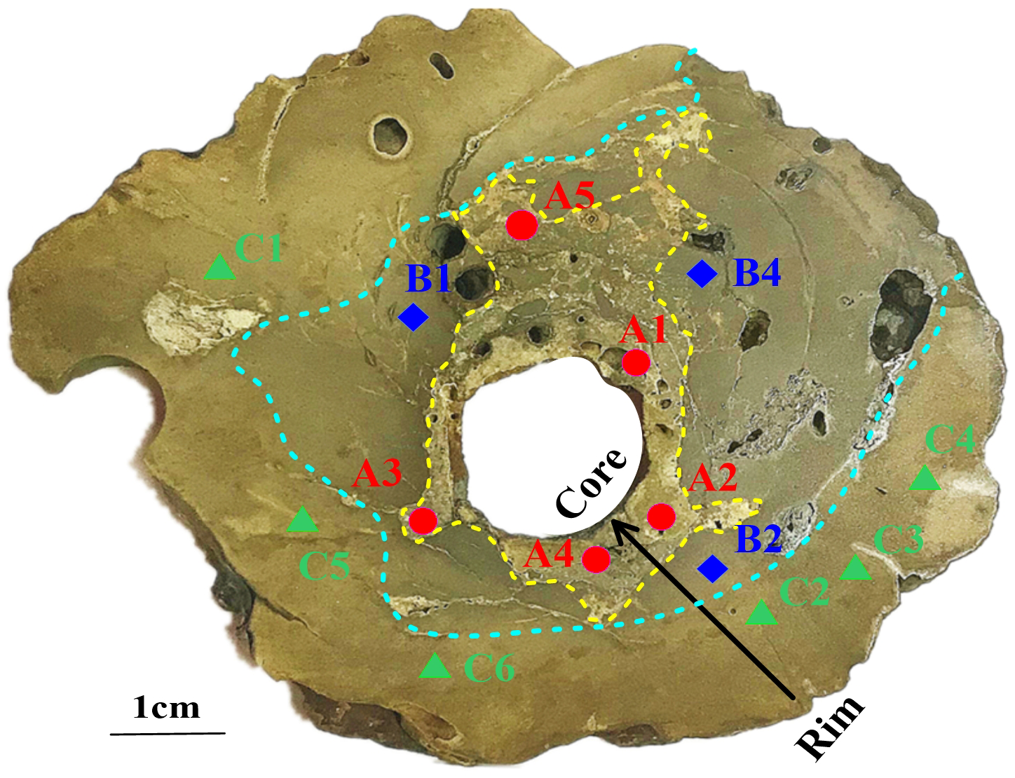 Photographs of the tubular seep carbonate SQW-65. The dashed blue line represents the dividing line between zones B and C. The dashed yellow line represents the dividing line between zones B and A. The sampling locations are indicated by circles (red), triangles (green), and diamonds (blue).