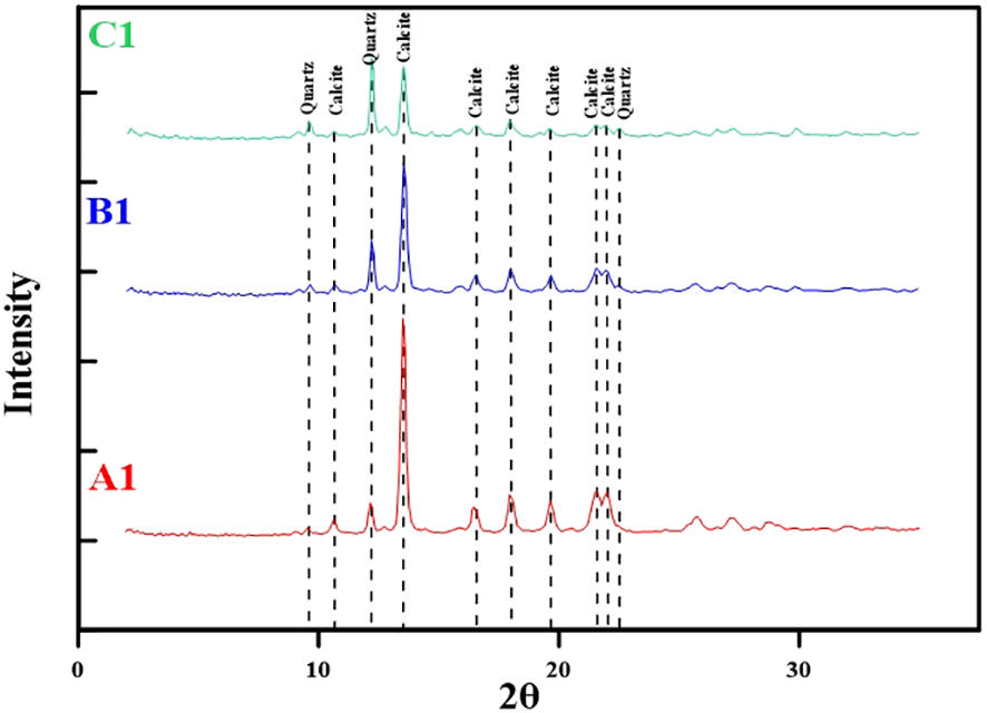 An XRD with an in situ microzone analysis function was used to identify mineral components. The experiment was completed in the Guangdong Provincial Key Laboratory of Marine Resources and Coastal Engineering, following the procedure described by Wei et al. (2023). The measurements were obtained using a Rigaku Rapid II X-ray diffraction system (Mo Kα radiation). The working voltage was 50 kV, the current was 30 mA, the incident beam spot diameter was 0.1 mm, and the exposure time was 5 min. Moreover, mineral phases were identified and quantitatively calculated using PDXL2 software according to the method described by Rietveld (1967).
