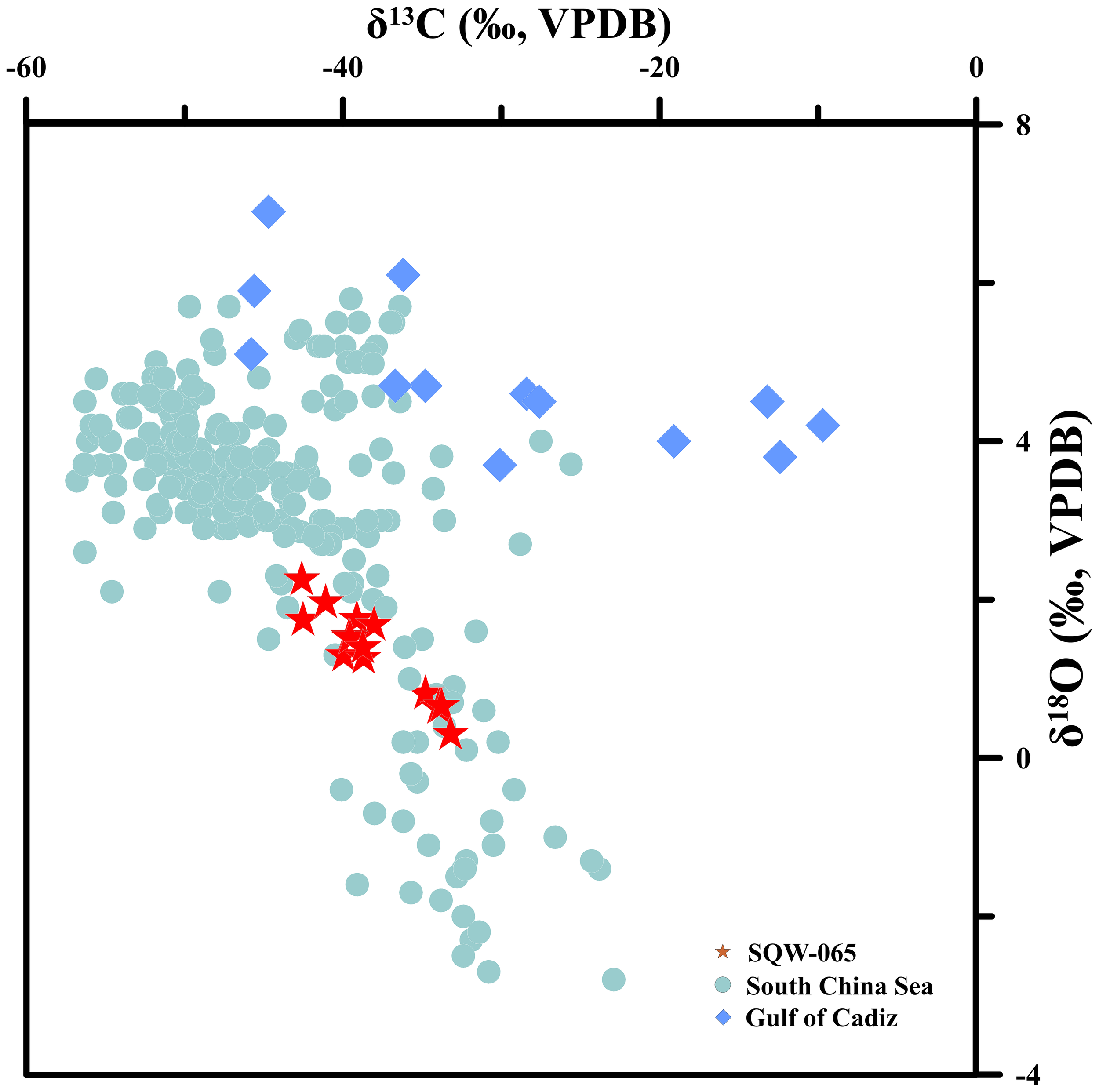 Carbon and oxygen isotopic compositions of seep carbonates: SQW-65 (this study), the South China Sea (TVG, Han et al., 2008; Ge et al., 2020; S03A and S04F, Yang et al., 2018; GMGS2-08, Deng et al., 2021; Site F, Feng and Chen, 2015; ROV1and ROV2, Liang et al., 2017; HS4DG, Tong et al., 2013, Ge et al., 2020; R1-R5, Liang et al., 2022), Gulf of Cadiz (Wang et al., 2015).
