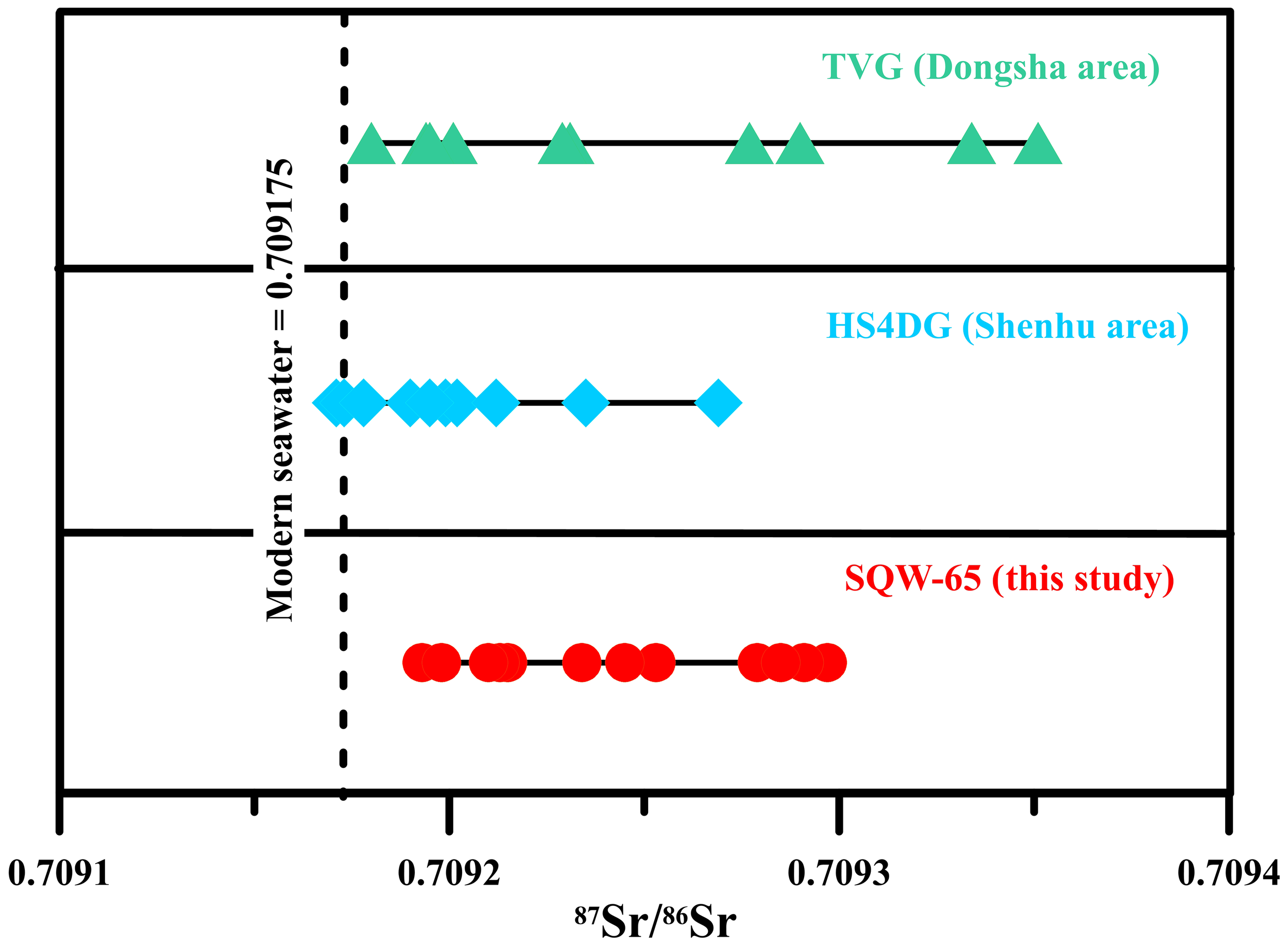 87Sr/86Sr ratios of authigenic carbonates from site SQW-65. The dashed line corresponds to the 87Sr/86Sr ratio of modern seawater (0.709175, Paytan et al., 1993). Dongsha (Ge et al., 2020), Shenhu (Ge et al., 2020), SQW-65 (this study).