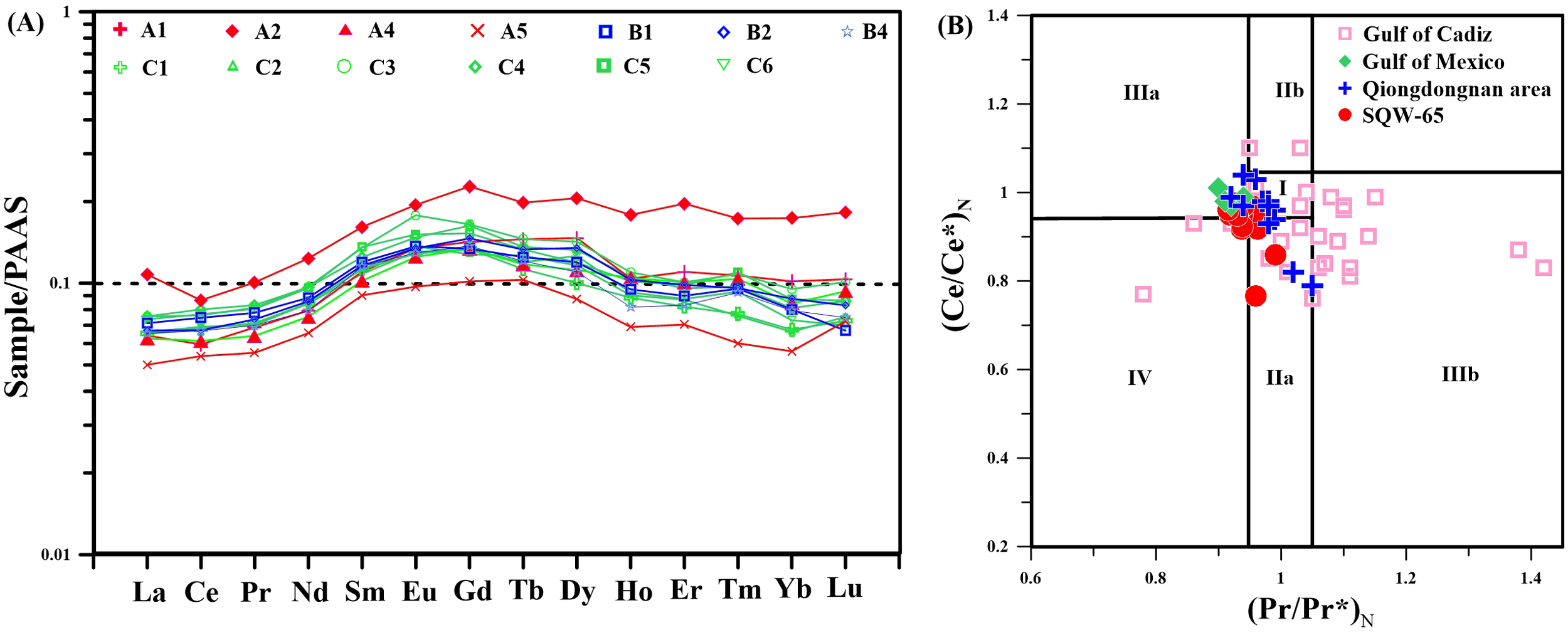 The rare earth element (REE) composition of the tubular seep carbonate (SQW-65) is reported in Supplementary Table S2. The REE contents were normalized against the PAAS (Taylor and McLennan, 1985). The shale-normalized REE patterns of samples did not exhibit Ce anomalies (Ce/Ce*average = 0.93) and middle REE (MREE) enrichment (n=13, Figure 6). In this study, Ce/Ce* = 3CeN/(2LaN + NdN) and Pr/Pr* = 2PrN/(CeN + NdN), where N refers to the normalization of the concentration against the PAAS (Taylor and McLennan, 1985).